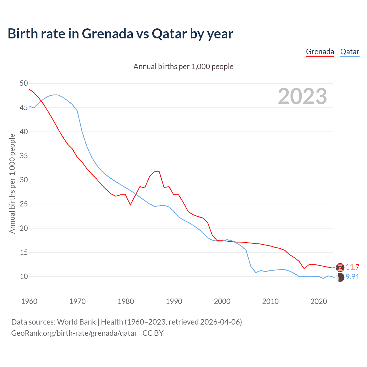 Grenada has an annual birth rate of 11.7 births per 1,000 people, compared to 9.91 for Qatar. The average number of children a woman is expected to have during her lifetime — the fertility rate, is 1.49 in Grenada and 1.73 in Qatar — 16.3% difference.