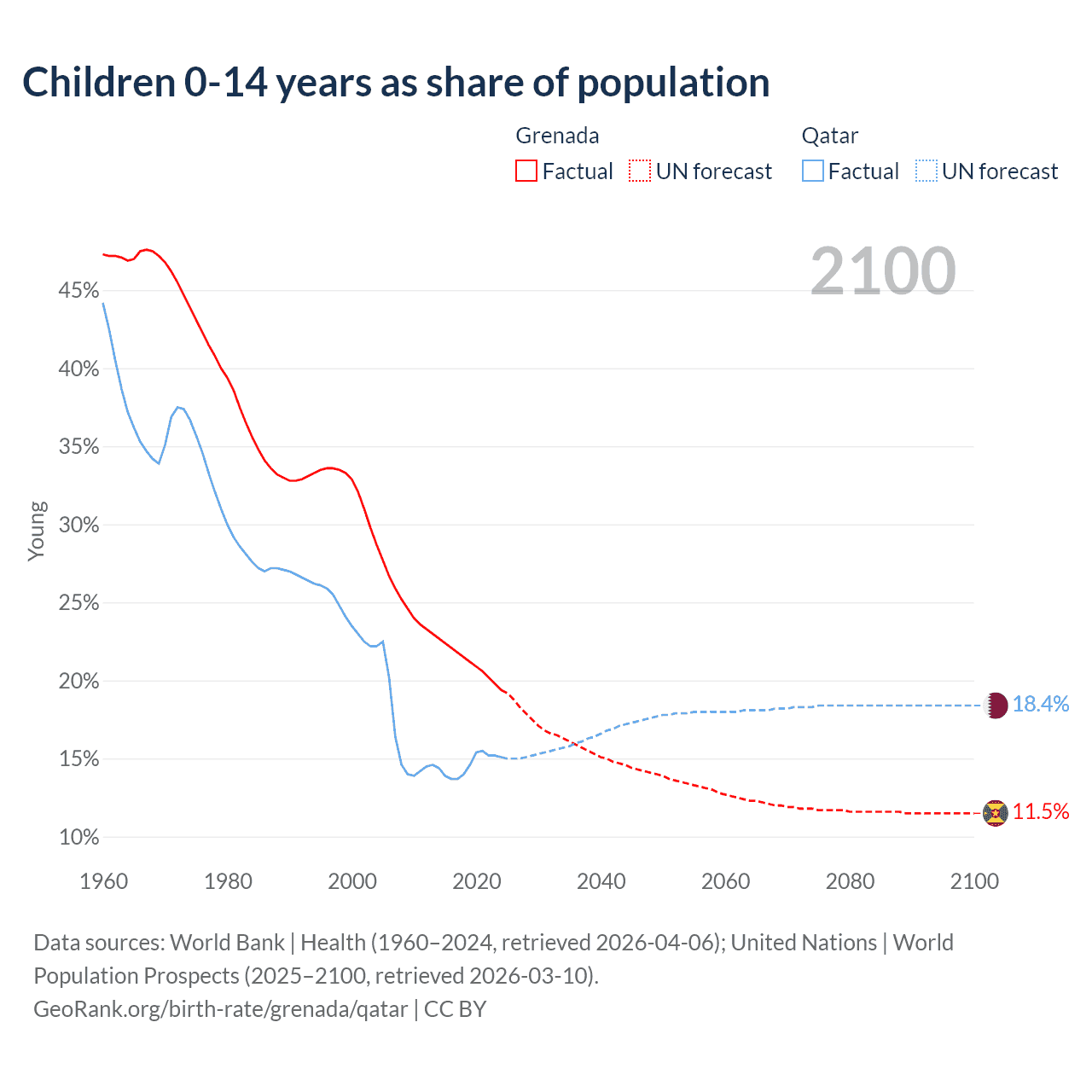 According to the latest available data on birth rates, the fertility rate in Grenada was 1.49 children per woman in 2023, compared to 1.73 in Qatar in 2023. The replacement level is considered to be 2.1 children per woman.