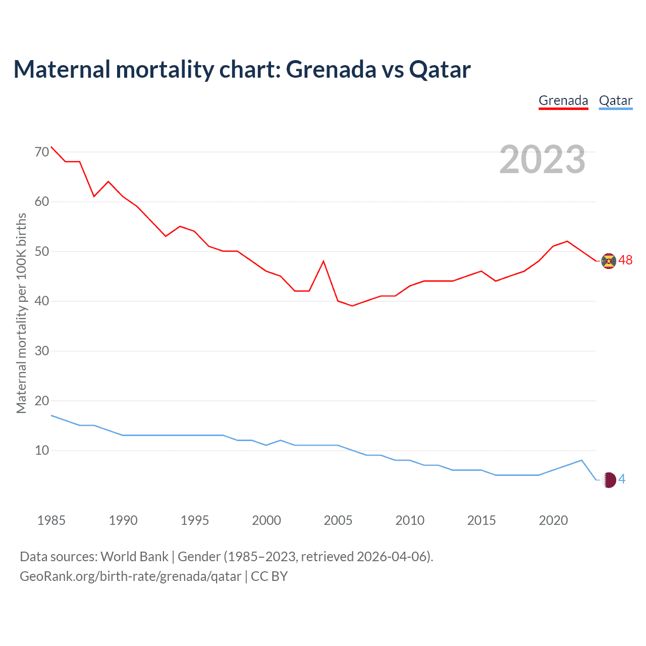 The maternal mortality rate, which is the probability of dying during childbirth or within 42 days of pregnancy termination, is 48 deaths per 100,000 live births in Grenada, compared to 4 deaths in Qatar.