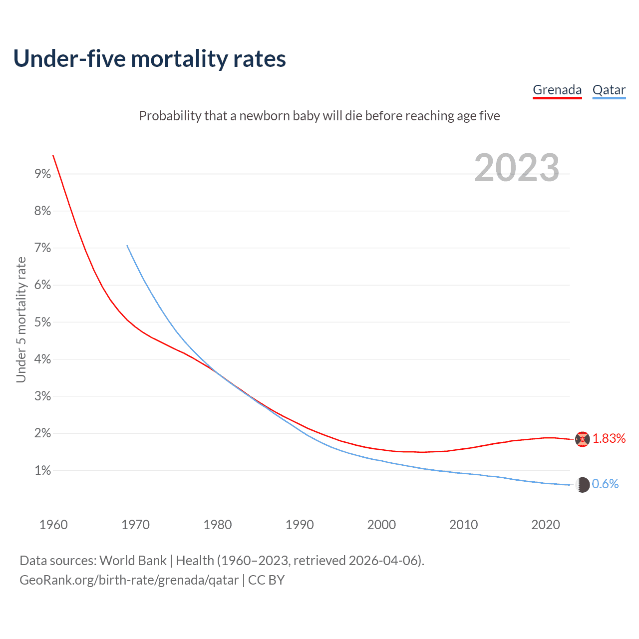 The chance that a newborn baby will die before reaching age five is 1.83% in Grenada and 0.6% in Qatar. Above is a chart with historical data on under-five mortality rates.