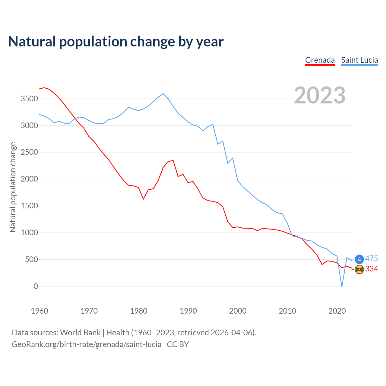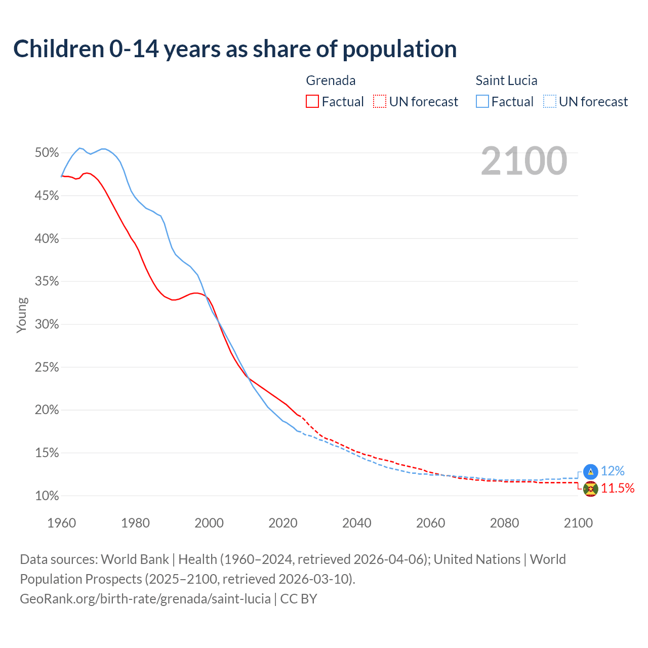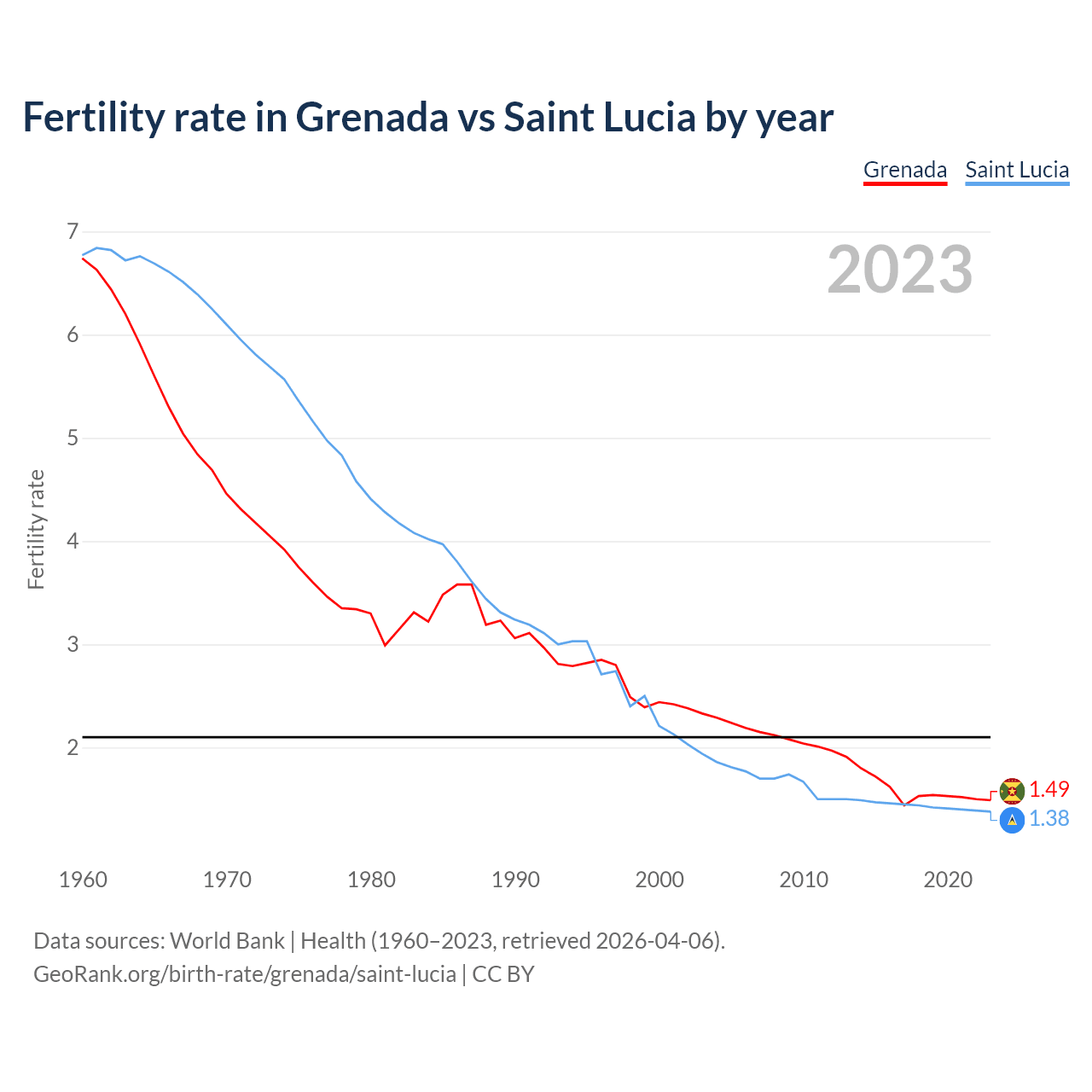 According to the latest available data on birth rates, the fertility rate in Grenada was 1.49 children per woman in 2023, compared to 1.38 in Saint Lucia in 2023. The replacement level is considered to be 2.1 children per woman.