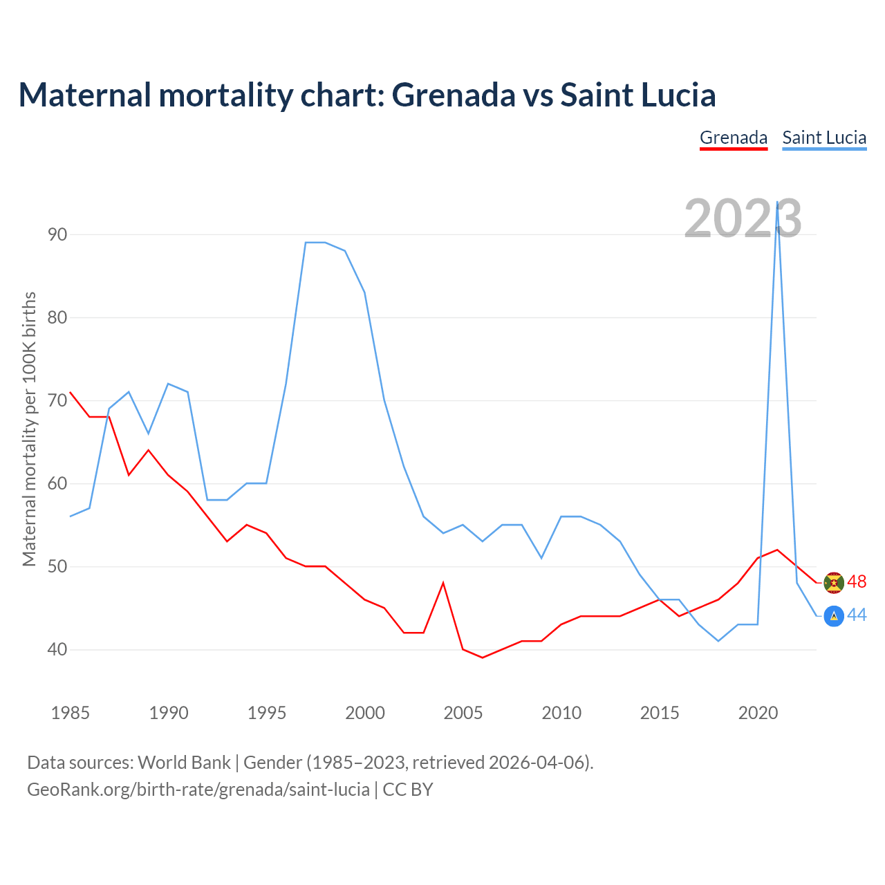 The maternal mortality rate, which is the probability of dying during childbirth or within 42 days of pregnancy termination, is 48 deaths per 100,000 live births in Grenada, compared to 44 deaths in Saint Lucia.