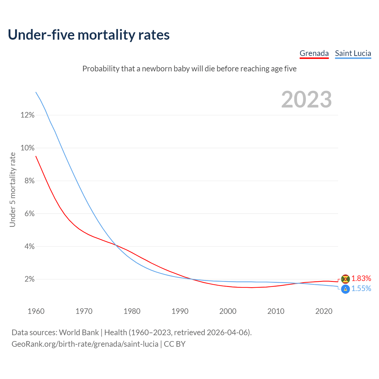 The chance that a newborn baby will die before reaching age five is 1.83% in Grenada and 1.55% in Saint Lucia. Above is a chart with historical data on under-five mortality rates.