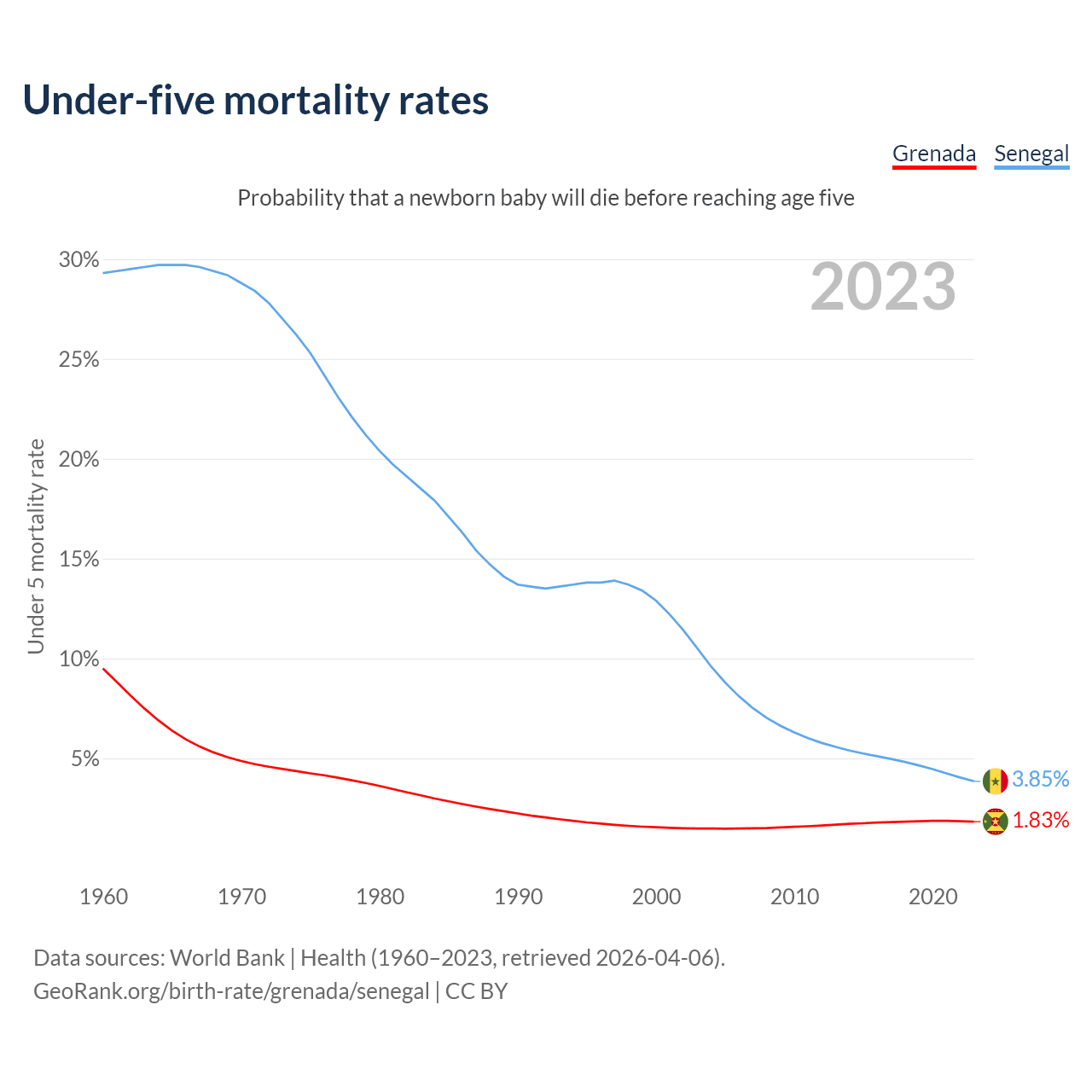 The chance that a newborn baby will die before reaching age five is 1.83% in Grenada and 3.85% in Senegal. Above is a chart with historical data on under-five mortality rates.