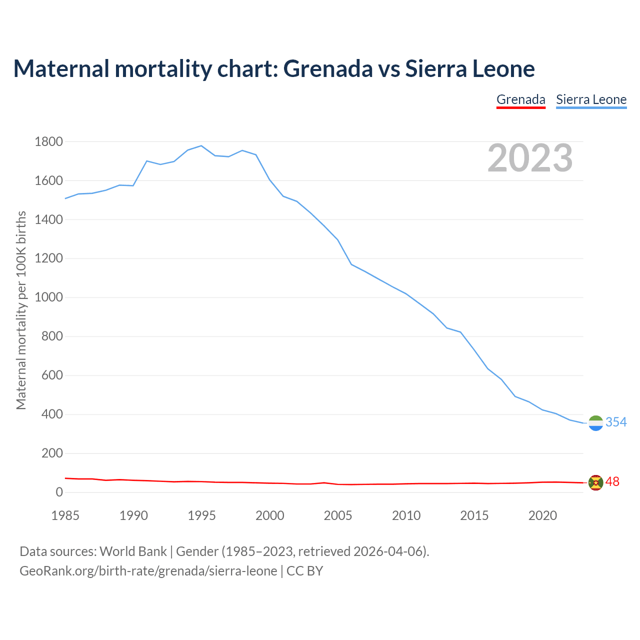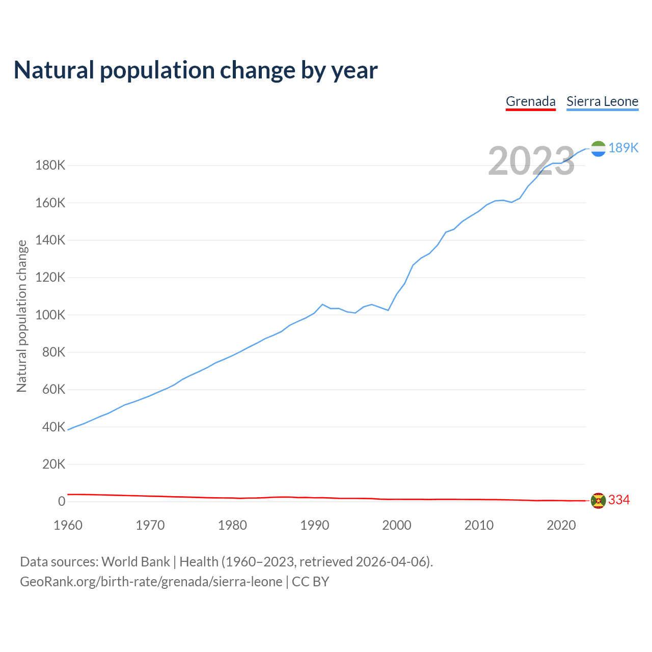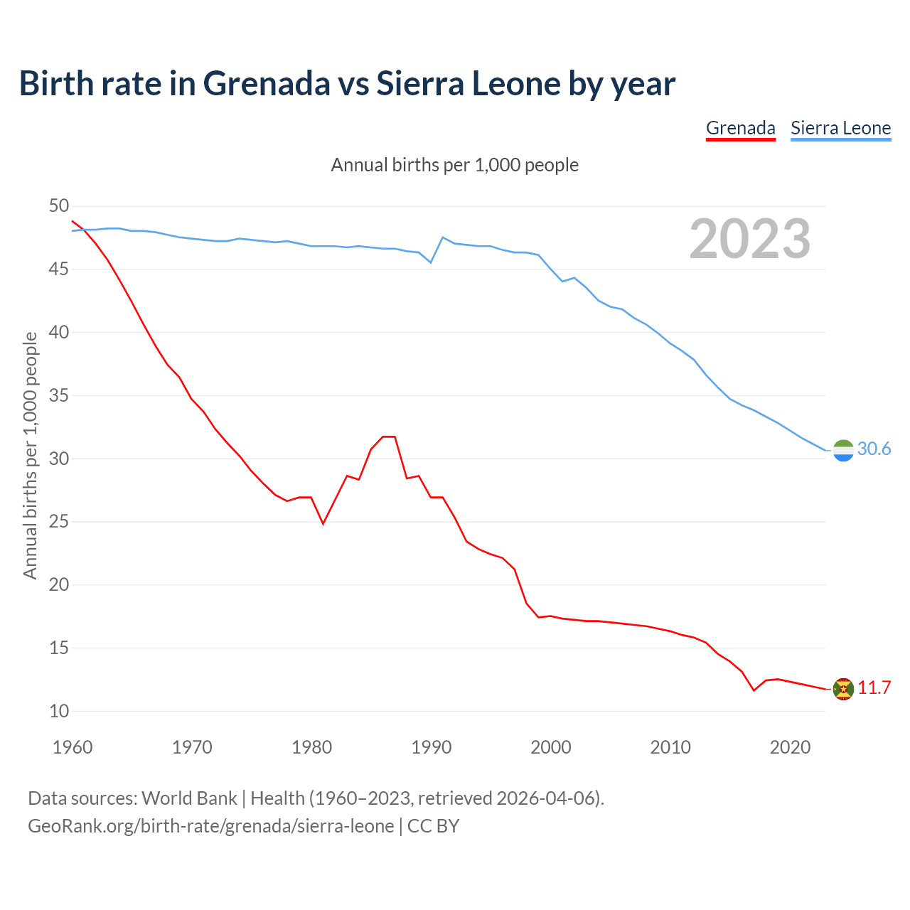 Grenada has an annual birth rate of 11.7 births per 1,000 people, compared to 30.6 for Sierra Leone. The average number of children a woman is expected to have during her lifetime — the fertility rate, is 1.49 in Grenada and 3.79 in Sierra Leone — 154.9% difference.