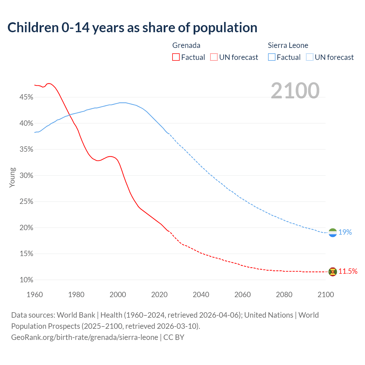 According to the latest available data on birth rates, the fertility rate in Grenada was 1.49 children per woman in 2023, compared to 3.79 in Sierra Leone in 2023. The replacement level is considered to be 2.1 children per woman.