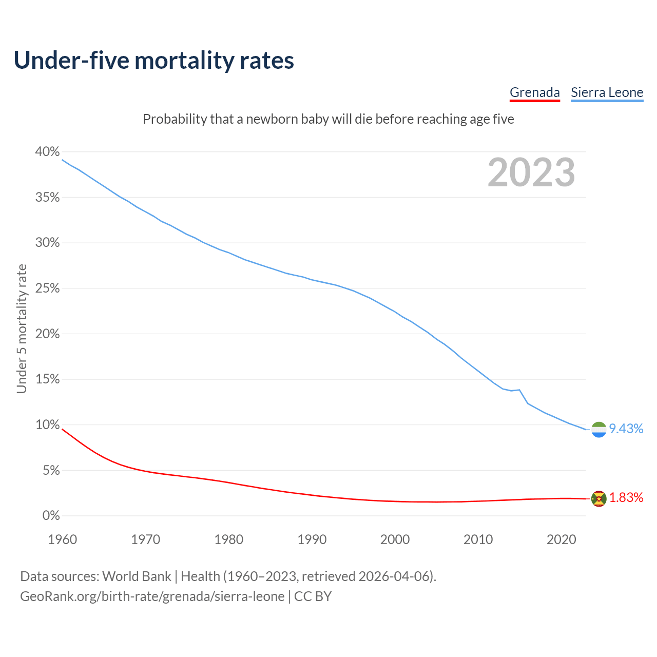 The chance that a newborn baby will die before reaching age five is 1.83% in Grenada and 9.43% in Sierra Leone. Above is a chart with historical data on under-five mortality rates.