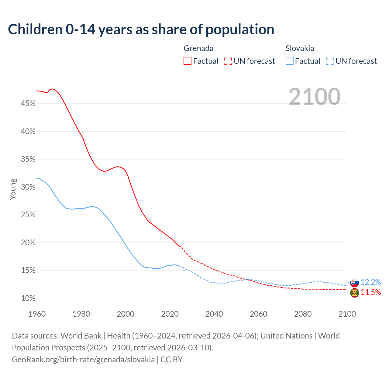 Grenada has an annual birth rate of 11.7 births per 1,000 people, compared to 9 for Slovakia. The average number of children a woman is expected to have during her lifetime — the fertility rate, is 1.49 in Grenada and 1.49 in Slovakia — 0.2% difference.