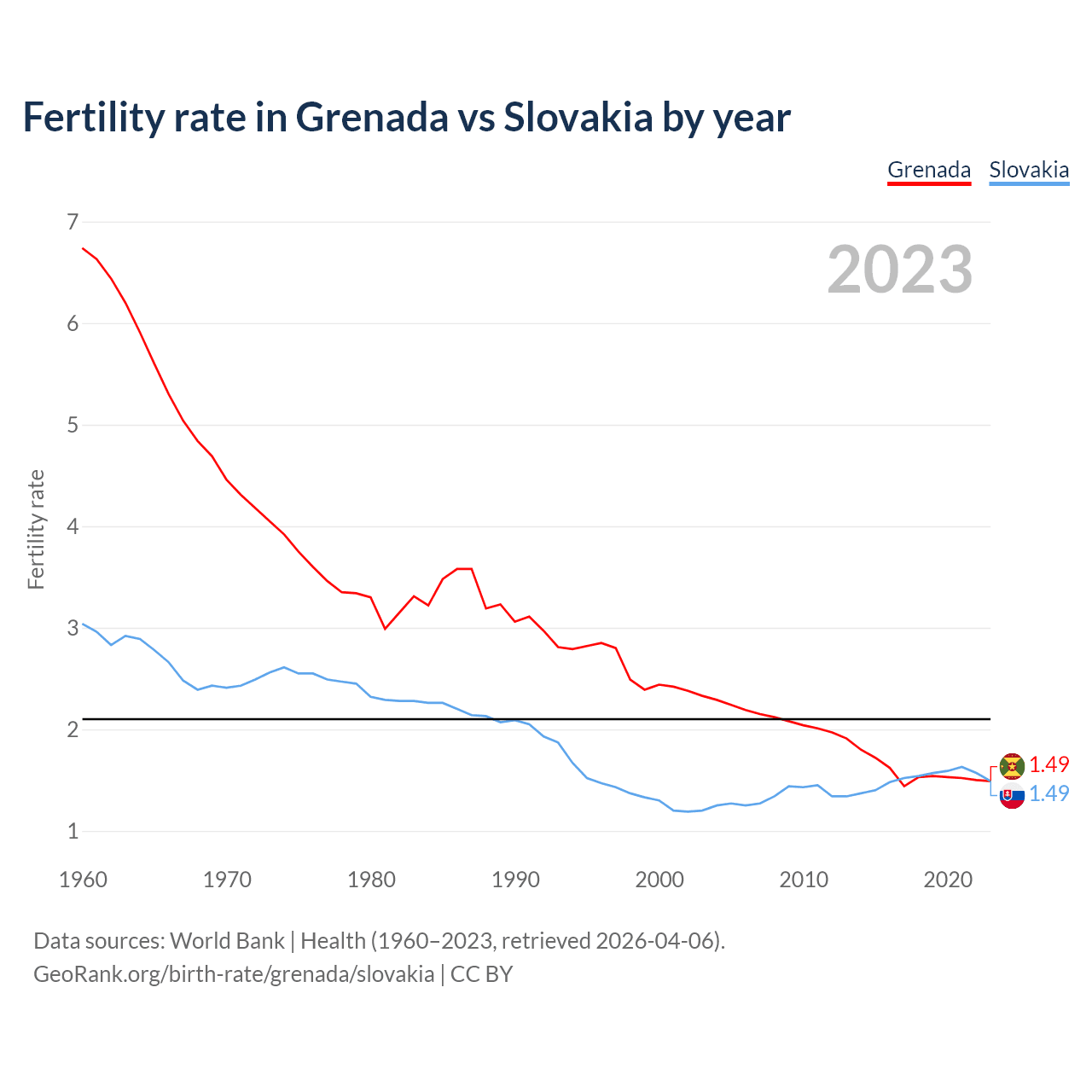 According to the latest available data on birth rates, the fertility rate in Grenada was 1.49 children per woman in 2023, compared to 1.49 in Slovakia in 2023. The replacement level is considered to be 2.1 children per woman.