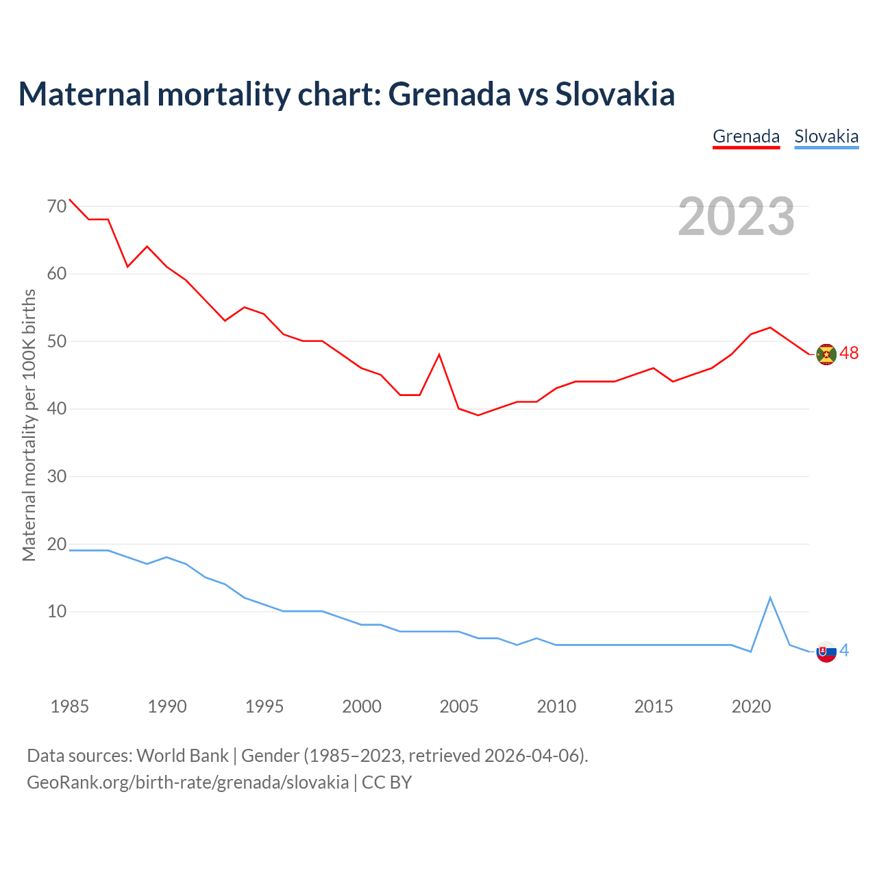 The maternal mortality rate, which is the probability of dying during childbirth or within 42 days of pregnancy termination, is 48 deaths per 100,000 live births in Grenada, compared to 4 deaths in Slovakia.