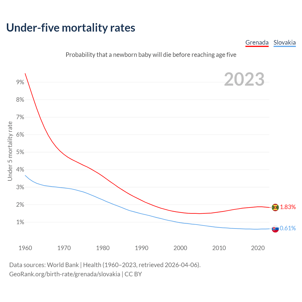 The chance that a newborn baby will die before reaching age five is 1.83% in Grenada and 0.61% in Slovakia. Above is a chart with historical data on under-five mortality rates.