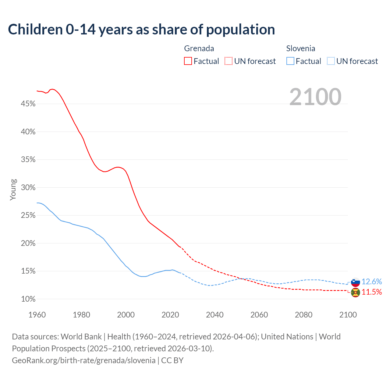 According to the latest available data on birth rates, the fertility rate in Grenada was 1.49 children per woman in 2023, compared to 1.51 in Slovenia in 2023. The replacement level is considered to be 2.1 children per woman.