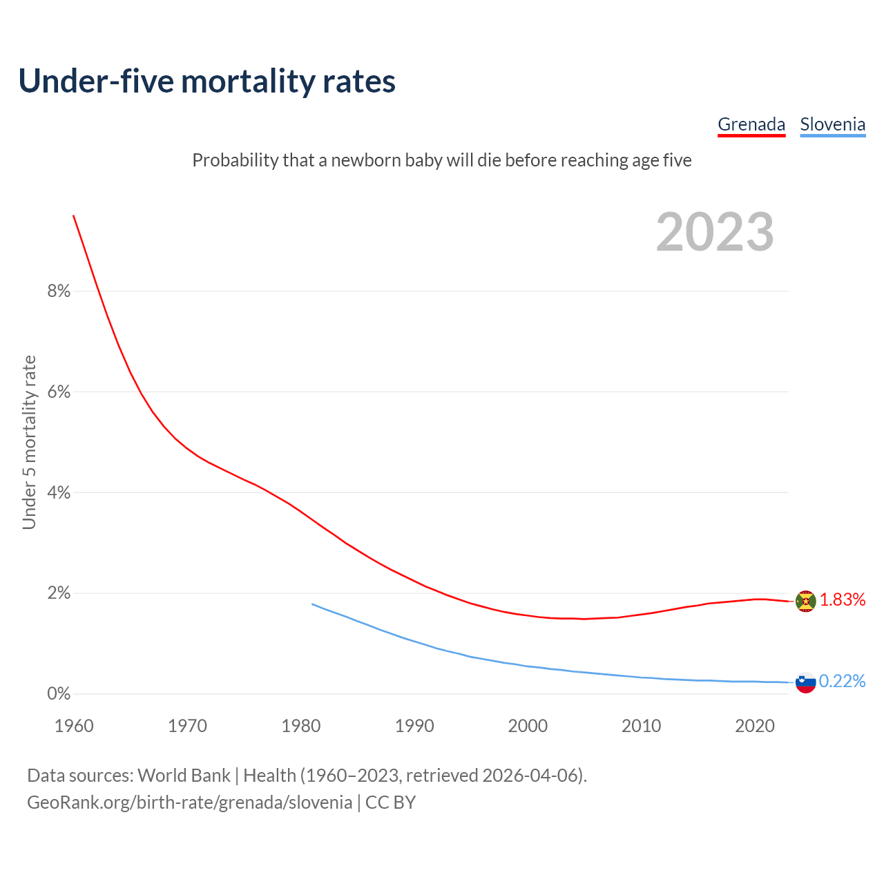 The chance that a newborn baby will die before reaching age five is 1.83% in Grenada and 0.22% in Slovenia. Above is a chart with historical data on under-five mortality rates.