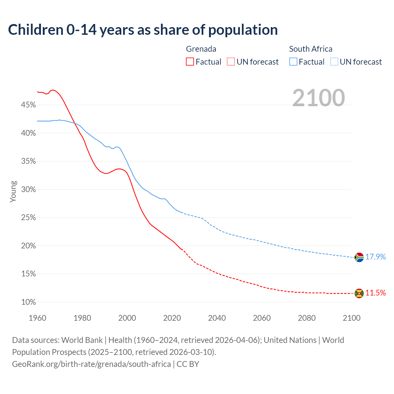 According to the latest available data on birth rates, the fertility rate in Grenada was 1.49 children per woman in 2023, compared to 2.22 in South Africa in 2023. The replacement level is considered to be 2.1 children per woman.