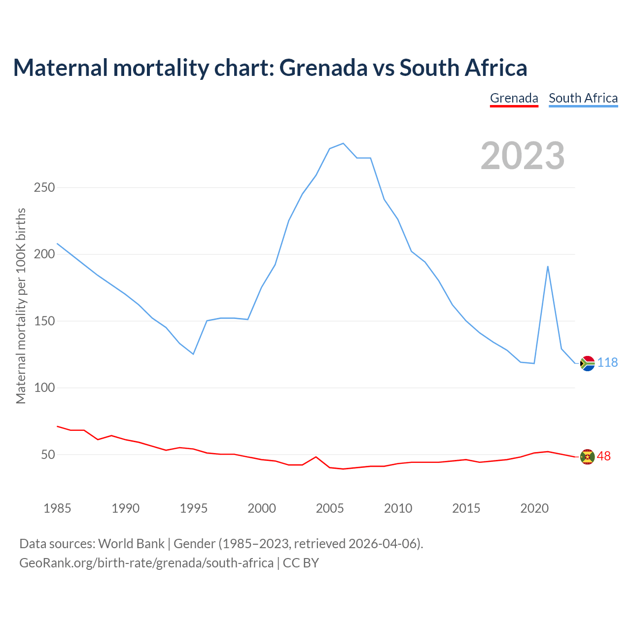 The maternal mortality rate, which is the probability of dying during childbirth or within 42 days of pregnancy termination, is 48 deaths per 100,000 live births in Grenada, compared to 118 deaths in South Africa.
