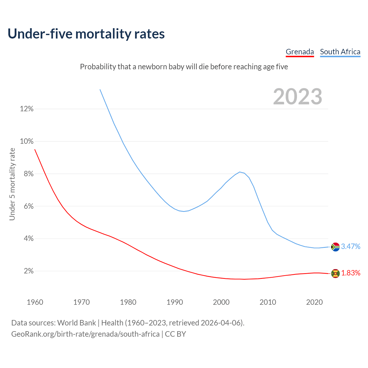 The chance that a newborn baby will die before reaching age five is 1.83% in Grenada and 3.47% in South Africa. Above is a chart with historical data on under-five mortality rates.