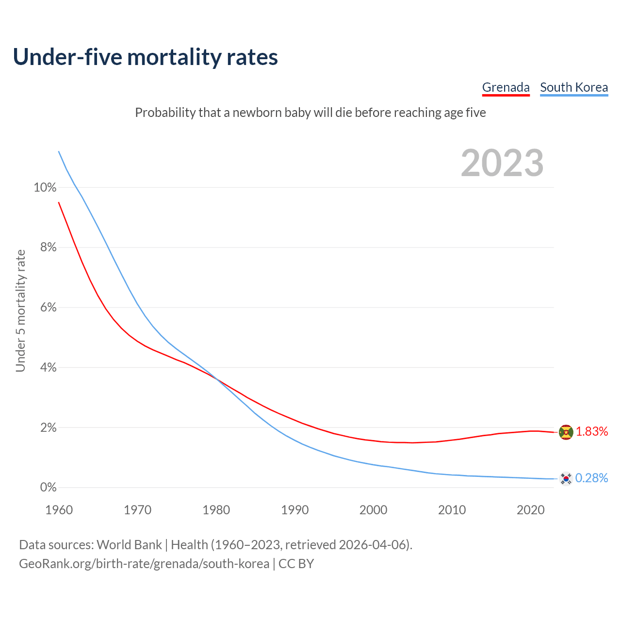The chance that a newborn baby will die before reaching age five is 1.83% in Grenada and 0.28% in South Korea. Above is a chart with historical data on under-five mortality rates.