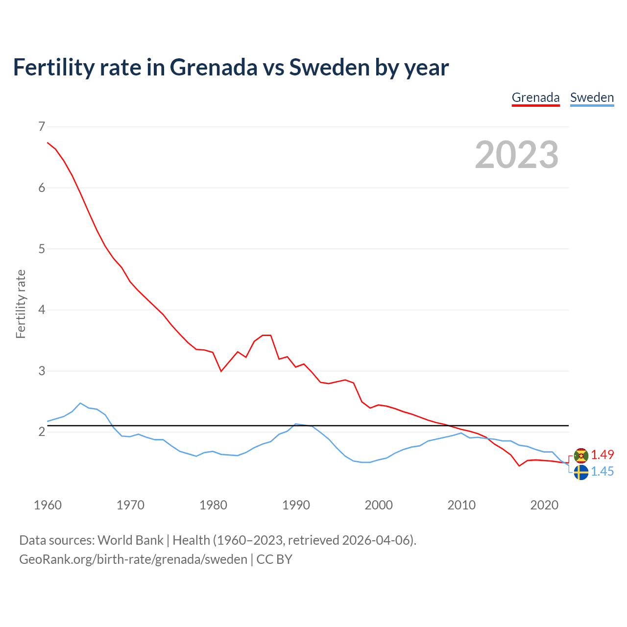 1960 vs 2023, the fertility rate has decreased by 77.9% in Grenada and by 33.2% in Sweden — in 1960, it was 6.74 and 2.17, respectively.