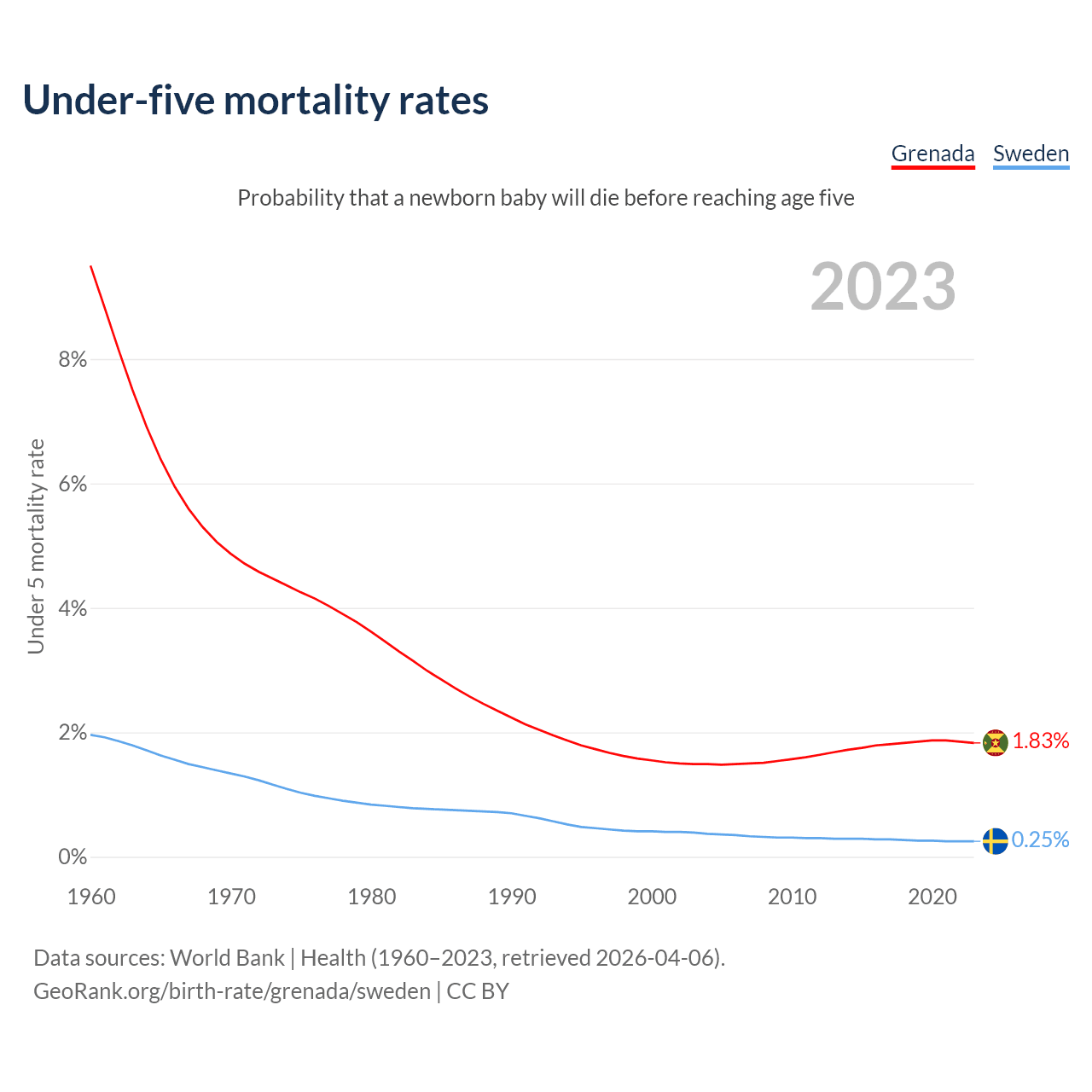 The chance that a newborn baby will die before reaching age five is 1.83% in Grenada and 0.25% in Sweden. Above is a chart with historical data on under-five mortality rates.