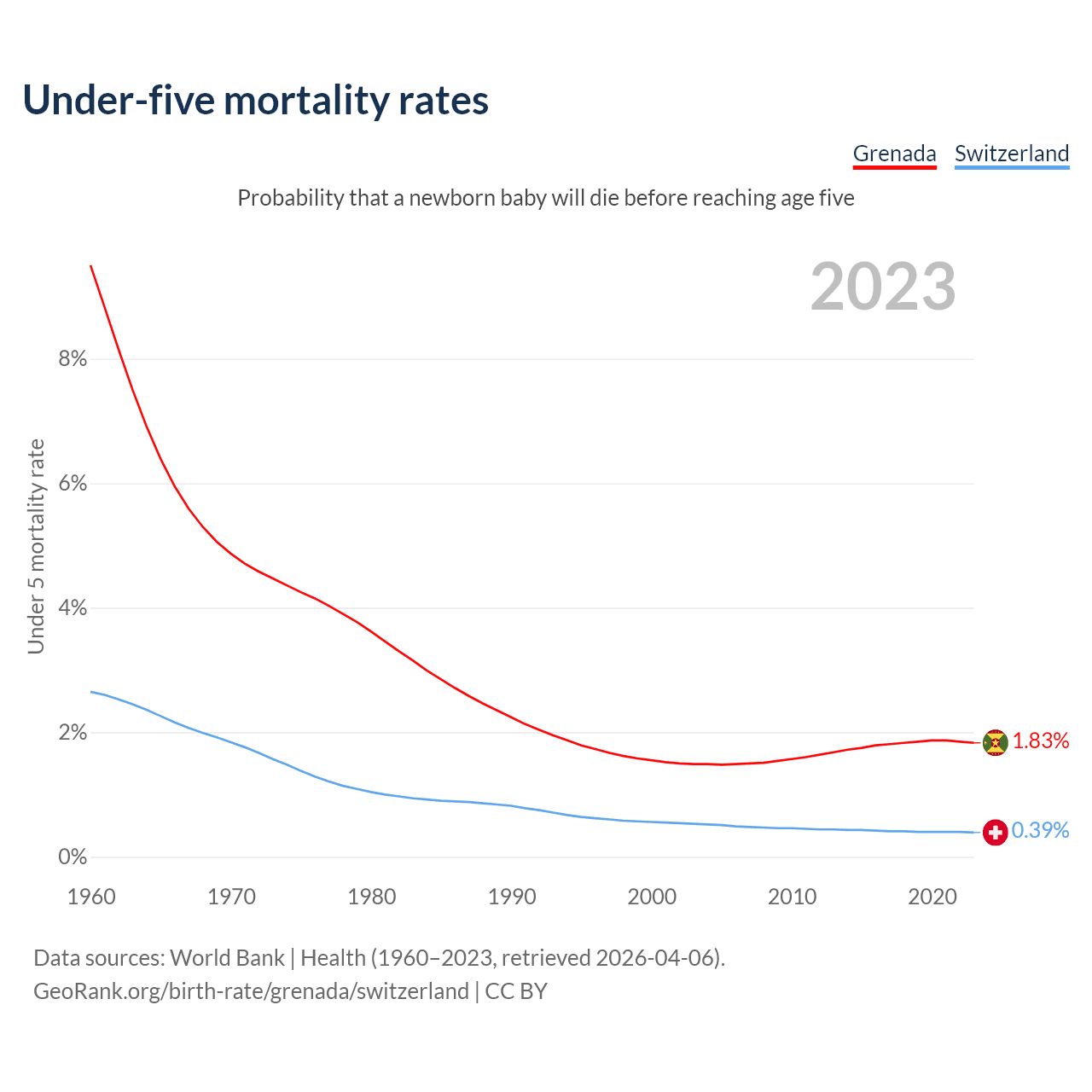 The chance that a newborn baby will die before reaching age five is 1.83% in Grenada and 0.39% in Switzerland. Above is a chart with historical data on under-five mortality rates.