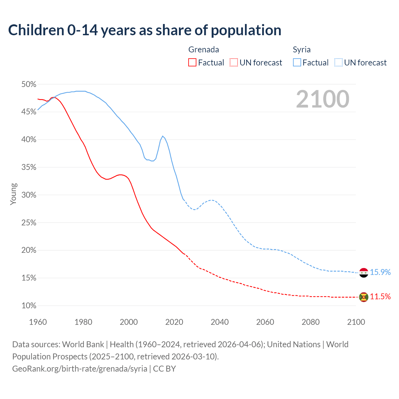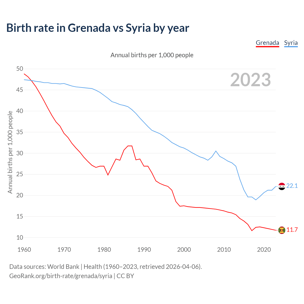 Grenada has an annual birth rate of 11.7 births per 1,000 people, compared to 22.1 for Syria. The average number of children a woman is expected to have during her lifetime — the fertility rate, is 1.49 in Grenada and 2.71 in Syria — 82.4% difference.