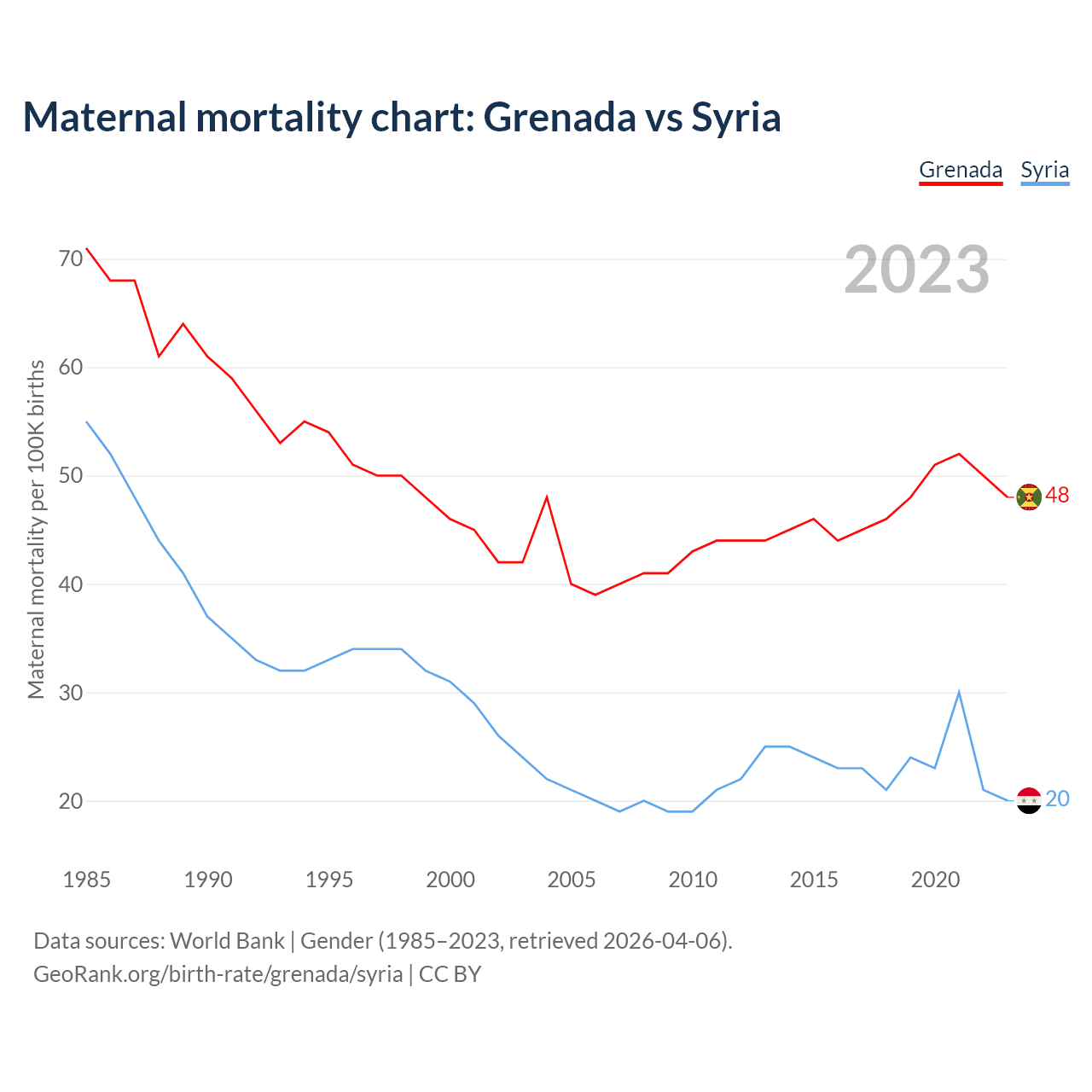 The maternal mortality rate, which is the probability of dying during childbirth or within 42 days of pregnancy termination, is 48 deaths per 100,000 live births in Grenada, compared to 20 deaths in Syria.