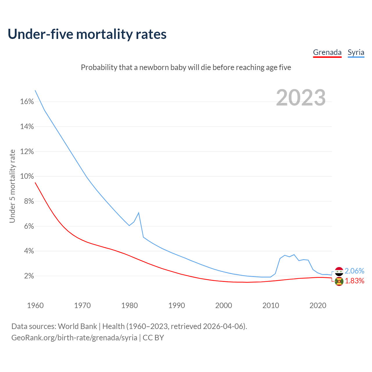The chance that a newborn baby will die before reaching age five is 1.83% in Grenada and 2.06% in Syria. Above is a chart with historical data on under-five mortality rates.
