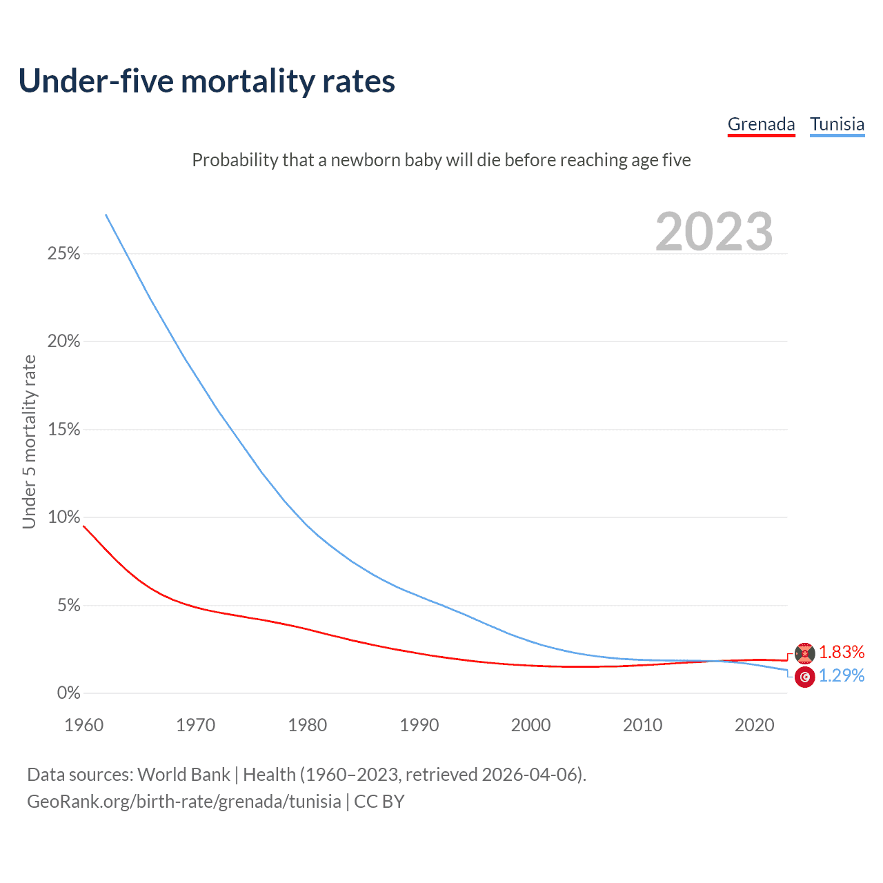 The chance that a newborn baby will die before reaching age five is 1.83% in Grenada and 1.29% in Tunisia. Above is a chart with historical data on under-five mortality rates.