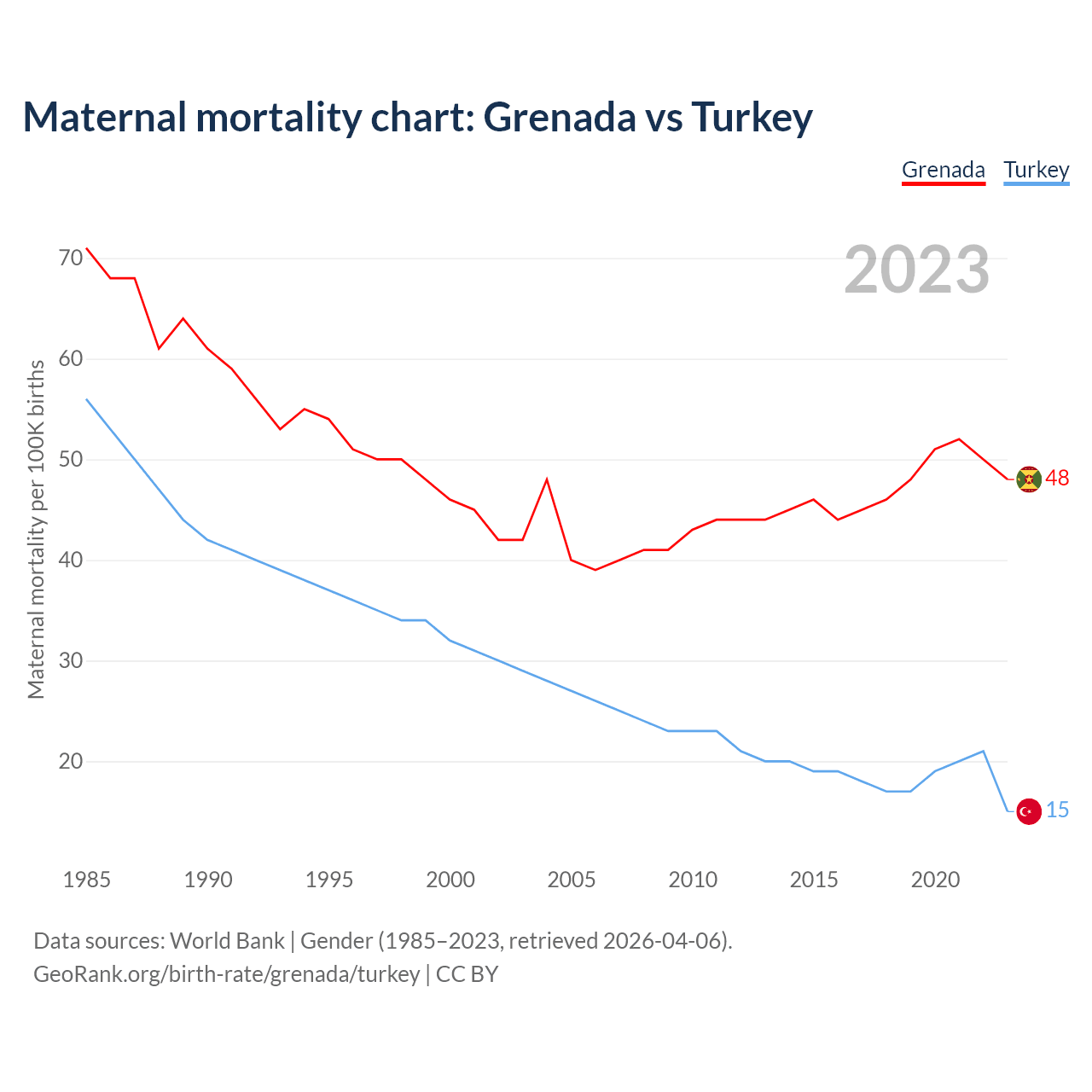 The maternal mortality rate, which is the probability of dying during childbirth or within 42 days of pregnancy termination, is 48 deaths per 100,000 live births in Grenada, compared to 15 deaths in Turkey.