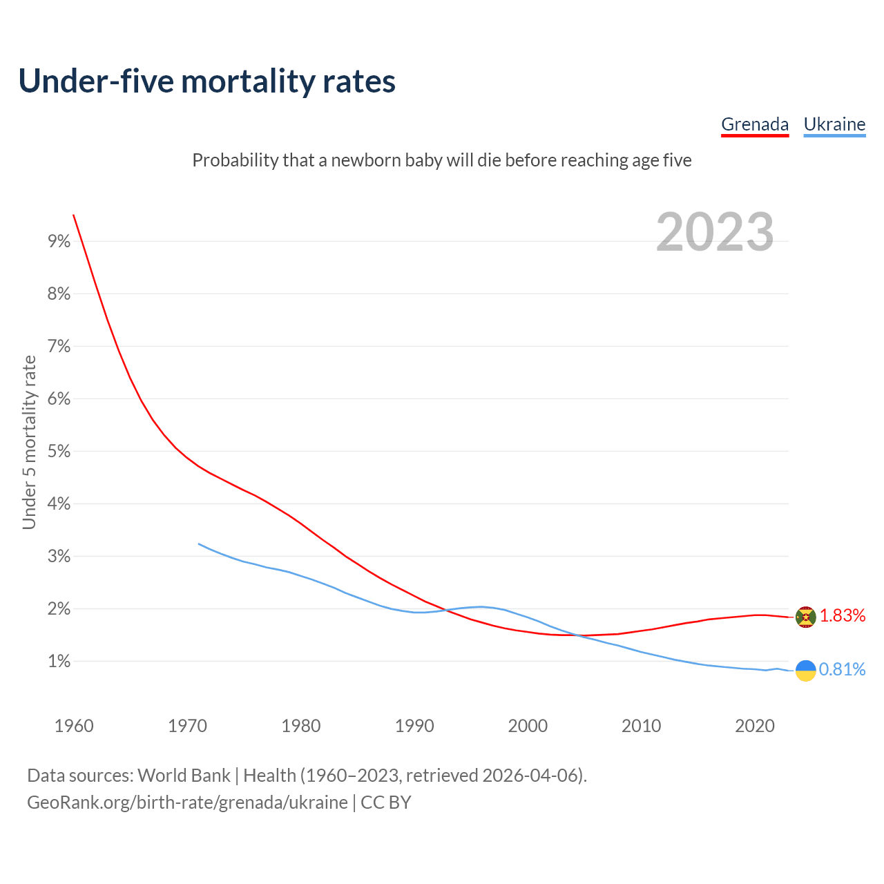 The chance that a newborn baby will die before reaching age five is 1.83% in Grenada and 0.81% in Ukraine. Above is a chart with historical data on under-five mortality rates.