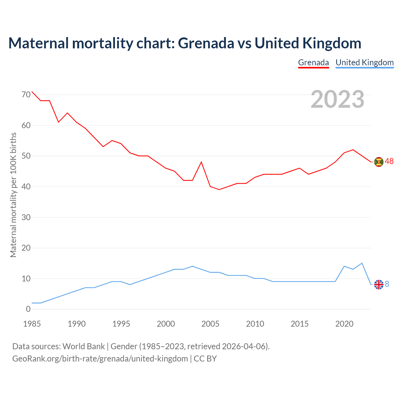 The maternal mortality rate, which is the probability of dying during childbirth or within 42 days of pregnancy termination, is 48 deaths per 100,000 live births in Grenada, compared to 8 deaths in the United Kingdom.