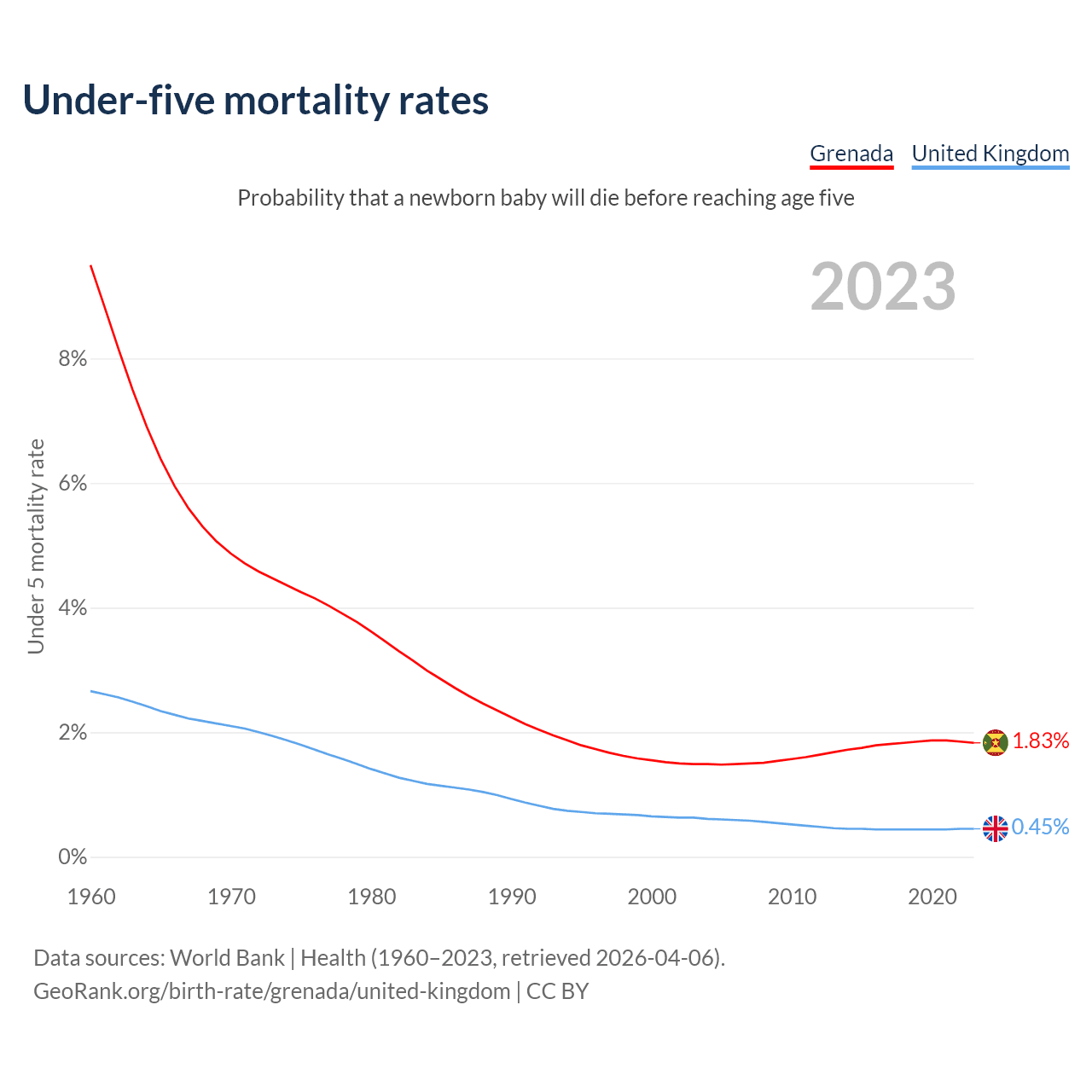 The chance that a newborn baby will die before reaching age five is 1.83% in Grenada and 0.45% in the United Kingdom. Above is a chart with historical data on under-five mortality rates.