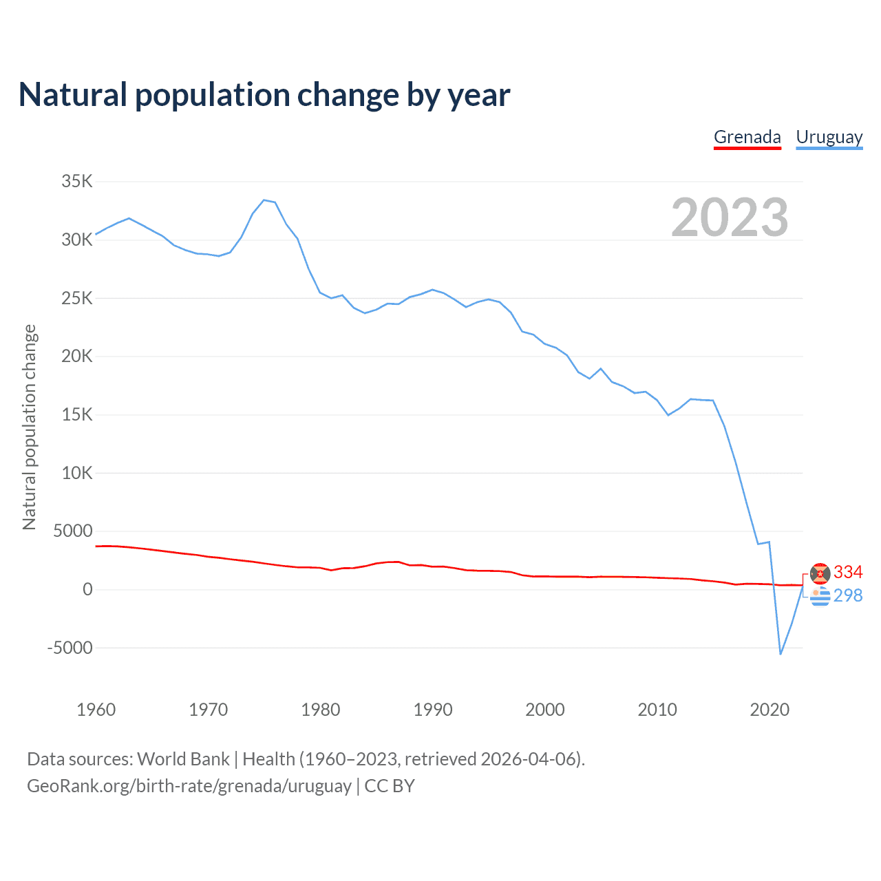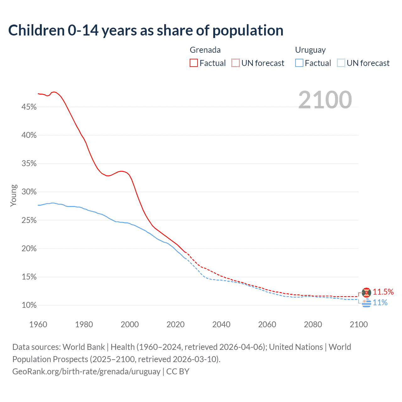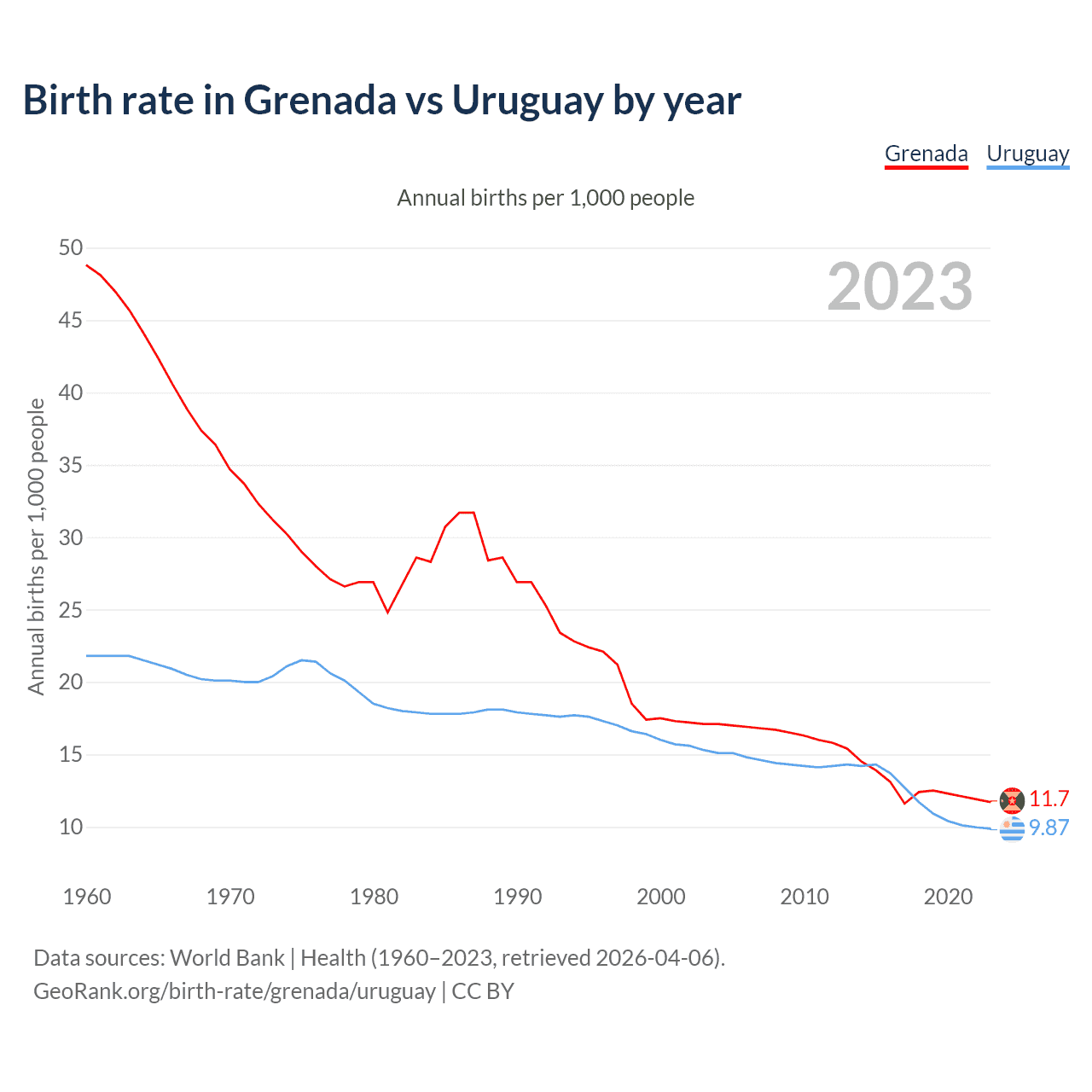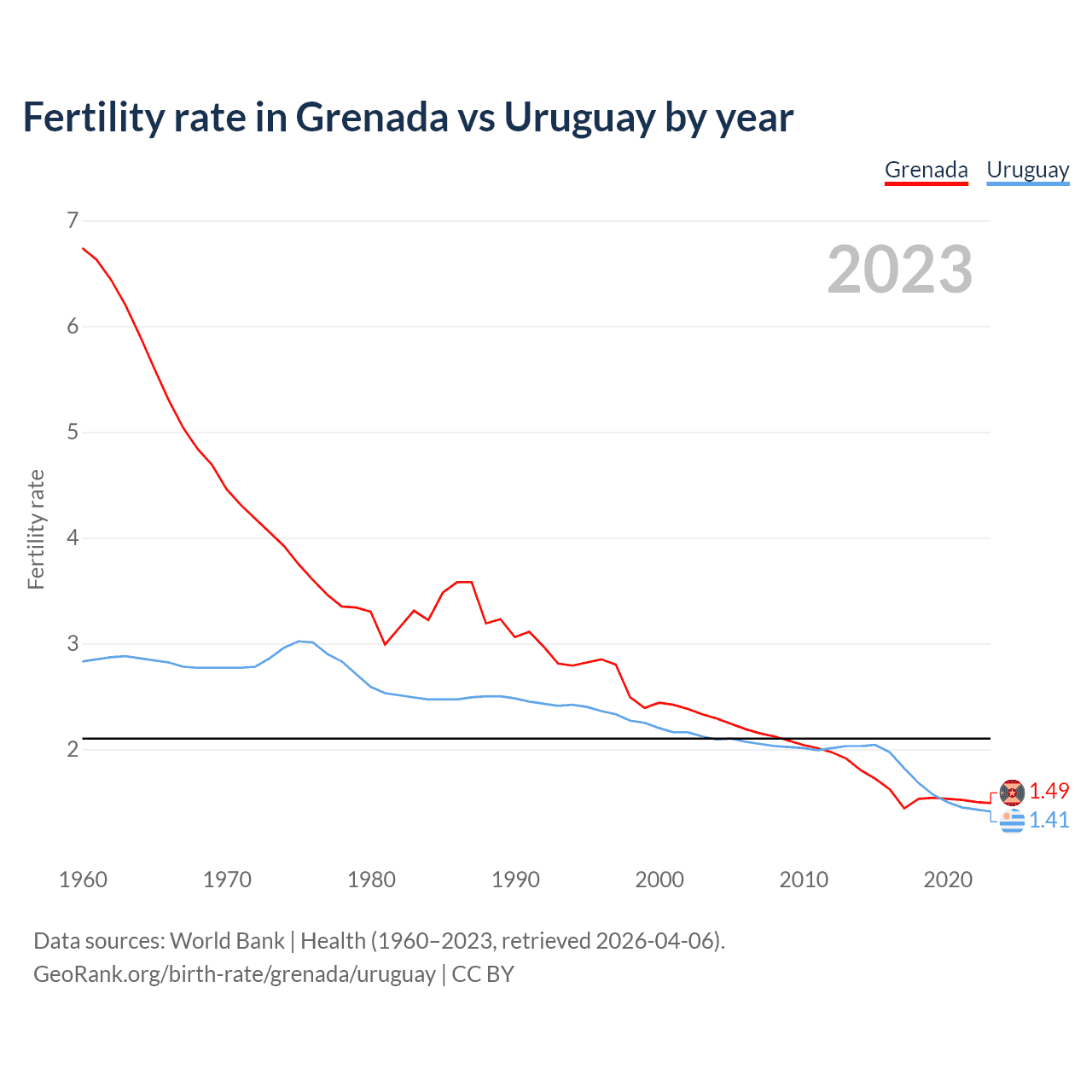 According to the latest available data on birth rates, the fertility rate in Grenada was 1.49 children per woman in 2023, compared to 1.41 in Uruguay in 2023. The replacement level is considered to be 2.1 children per woman.