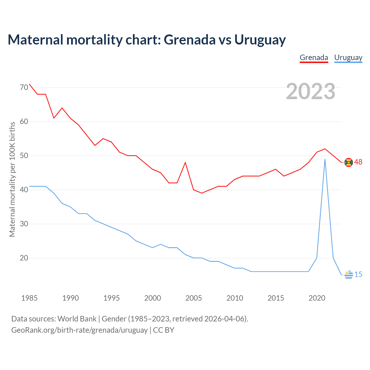 The maternal mortality rate, which is the probability of dying during childbirth or within 42 days of pregnancy termination, is 48 deaths per 100,000 live births in Grenada, compared to 15 deaths in Uruguay.