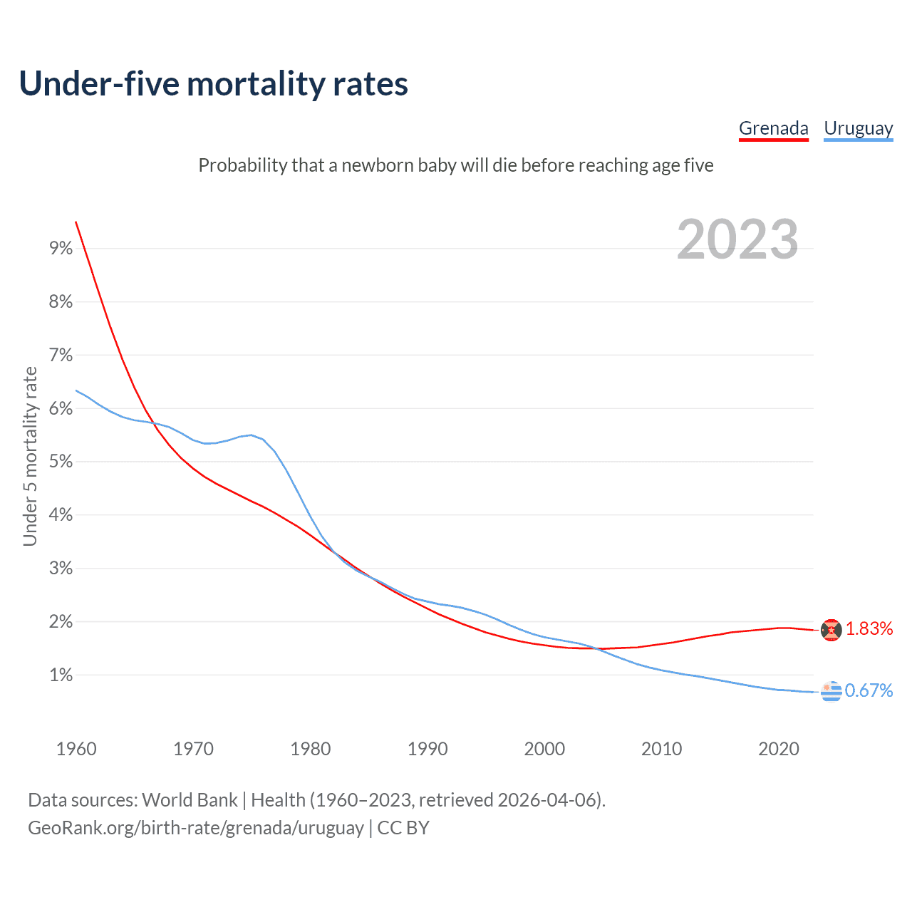 The chance that a newborn baby will die before reaching age five is 1.83% in Grenada and 0.67% in Uruguay. Above is a chart with historical data on under-five mortality rates.