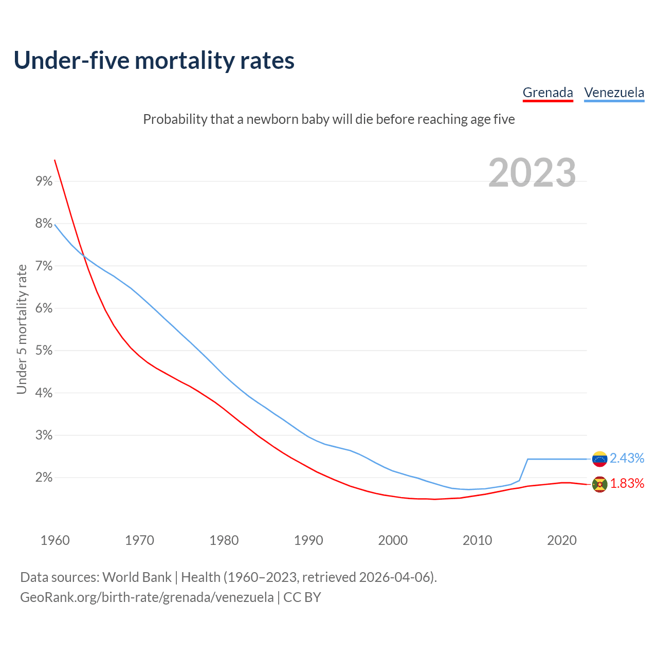 The chance that a newborn baby will die before reaching age five is 1.83% in Grenada and 2.43% in Venezuela. Above is a chart with historical data on under-five mortality rates.