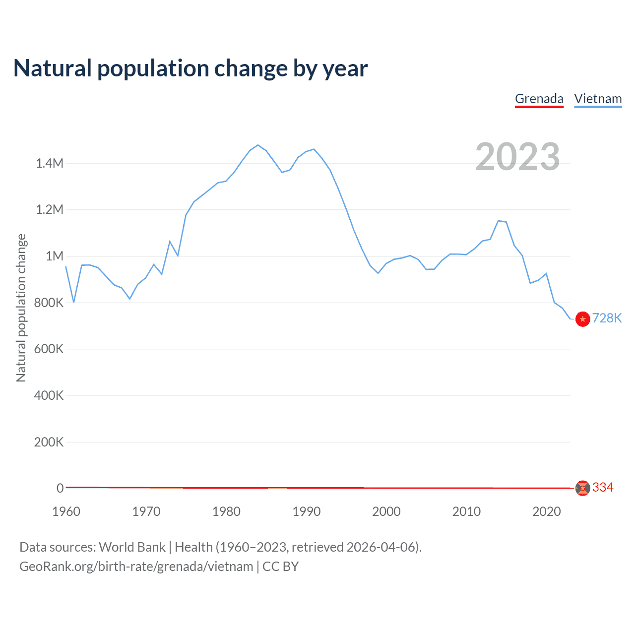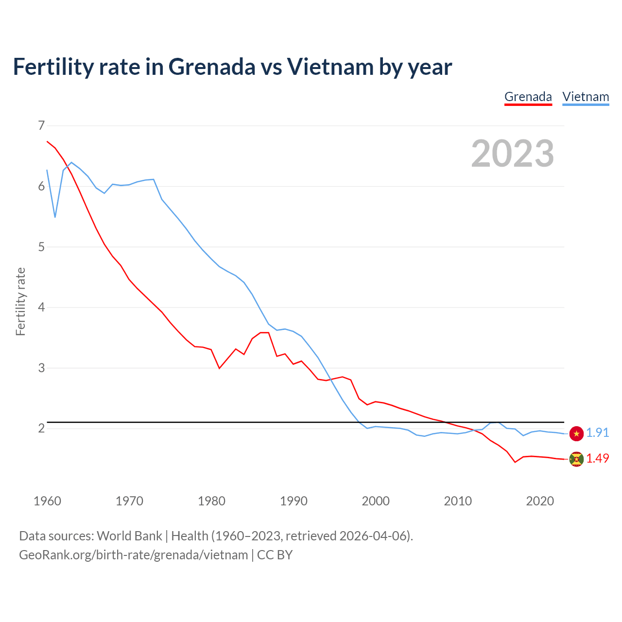 According to the latest available data on birth rates, the fertility rate in Grenada was 1.49 children per woman in 2023, compared to 1.91 in Vietnam in 2023. The replacement level is considered to be 2.1 children per woman.