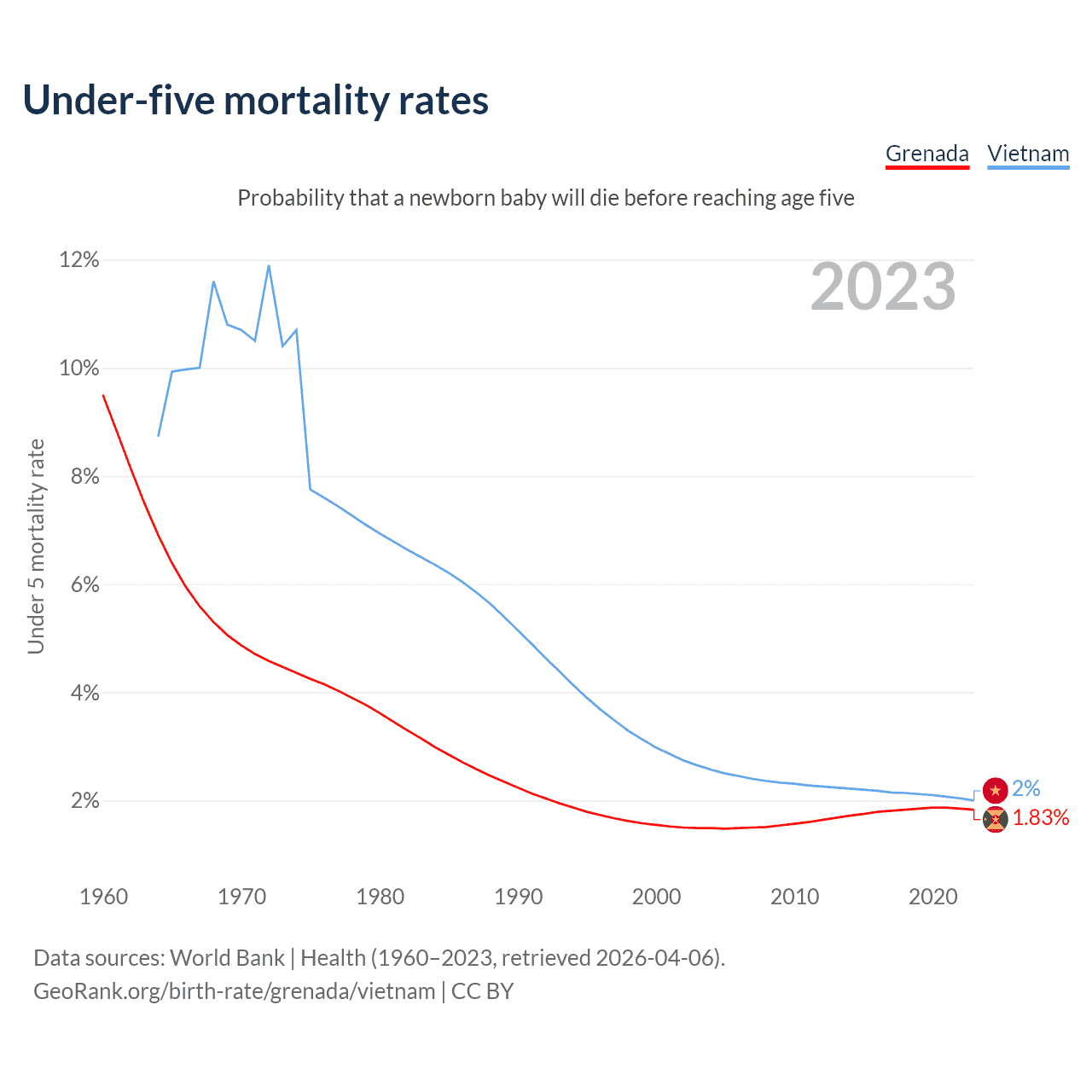 The chance that a newborn baby will die before reaching age five is 1.83% in Grenada and 2% in Vietnam. Above is a chart with historical data on under-five mortality rates.