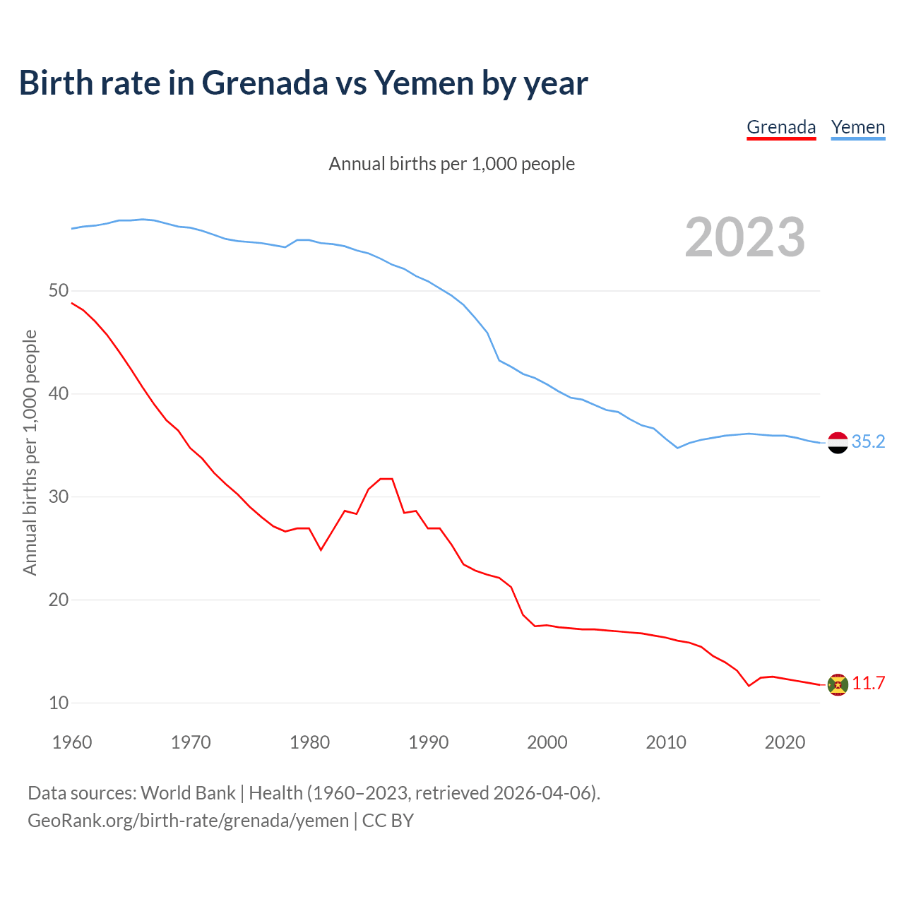 Grenada has an annual birth rate of 11.7 births per 1,000 people, compared to 35.2 for Yemen. The average number of children a woman is expected to have during her lifetime — the fertility rate, is 1.49 in Grenada and 4.59 in Yemen — 208.7% difference.