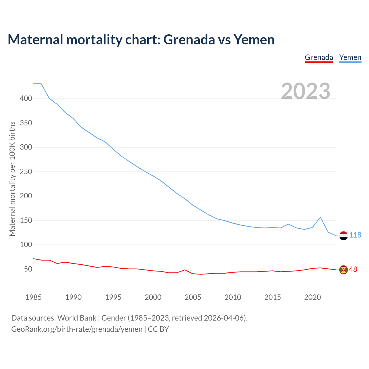 The maternal mortality rate, which is the probability of dying during childbirth or within 42 days of pregnancy termination, is 48 deaths per 100,000 live births in Grenada, compared to 118 deaths in Yemen.