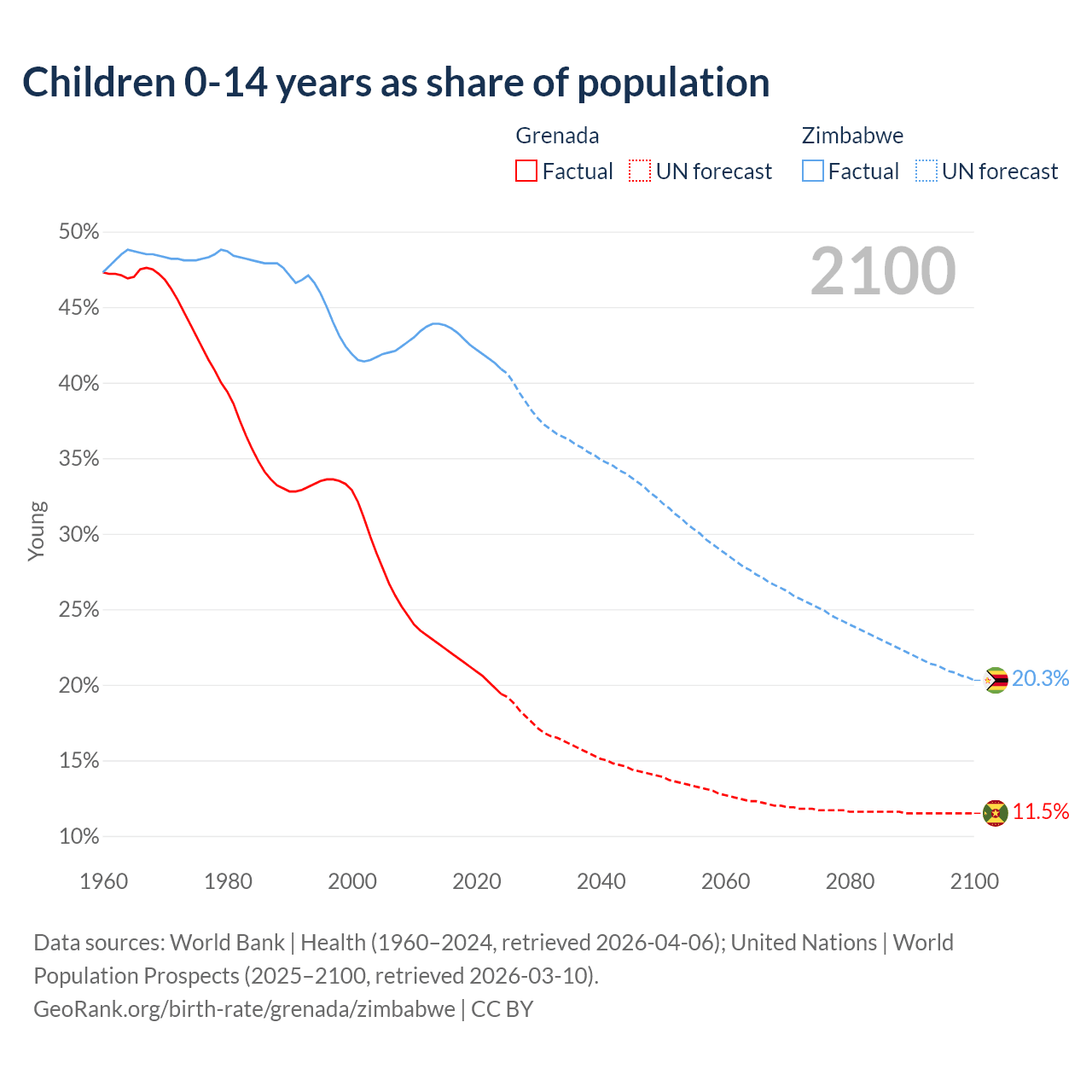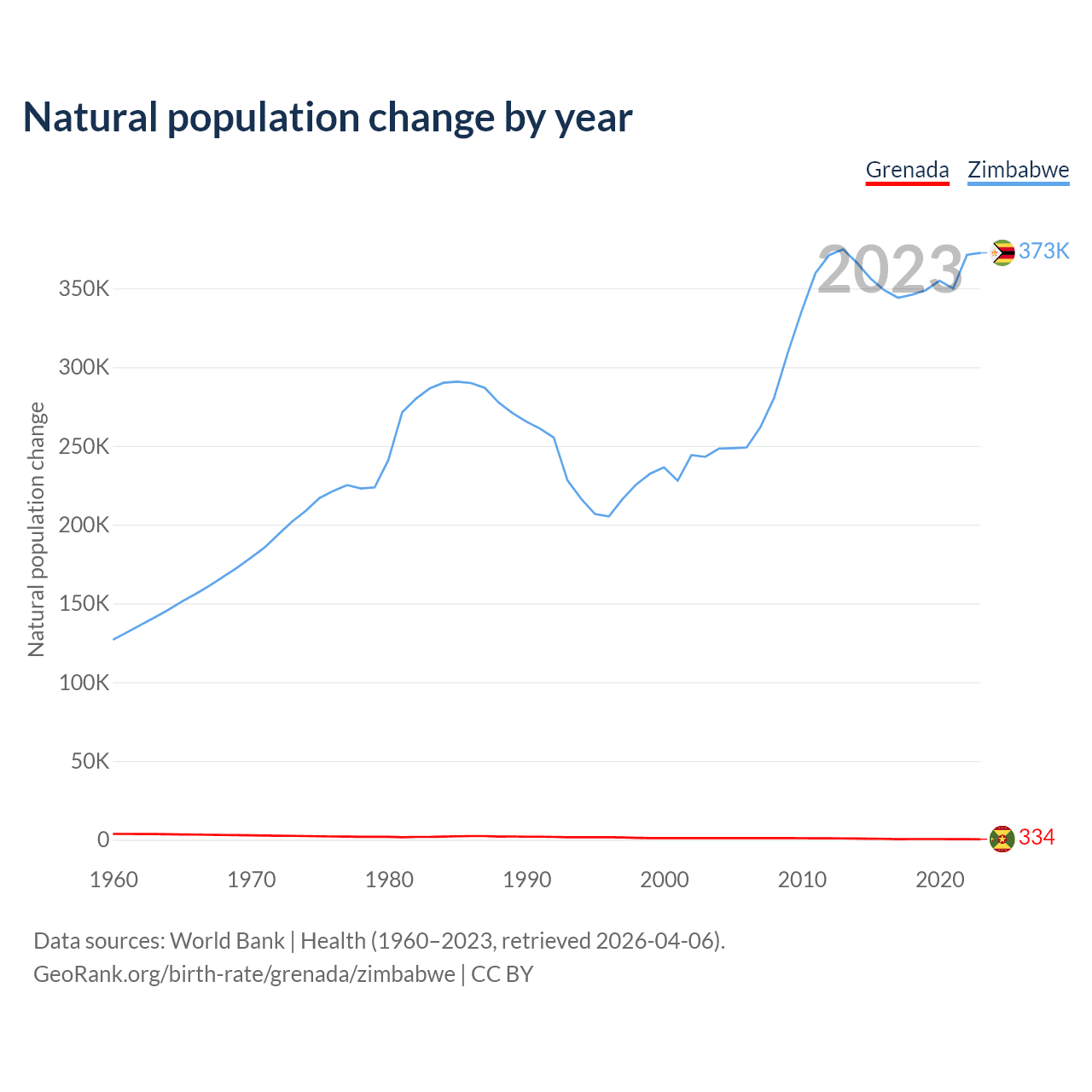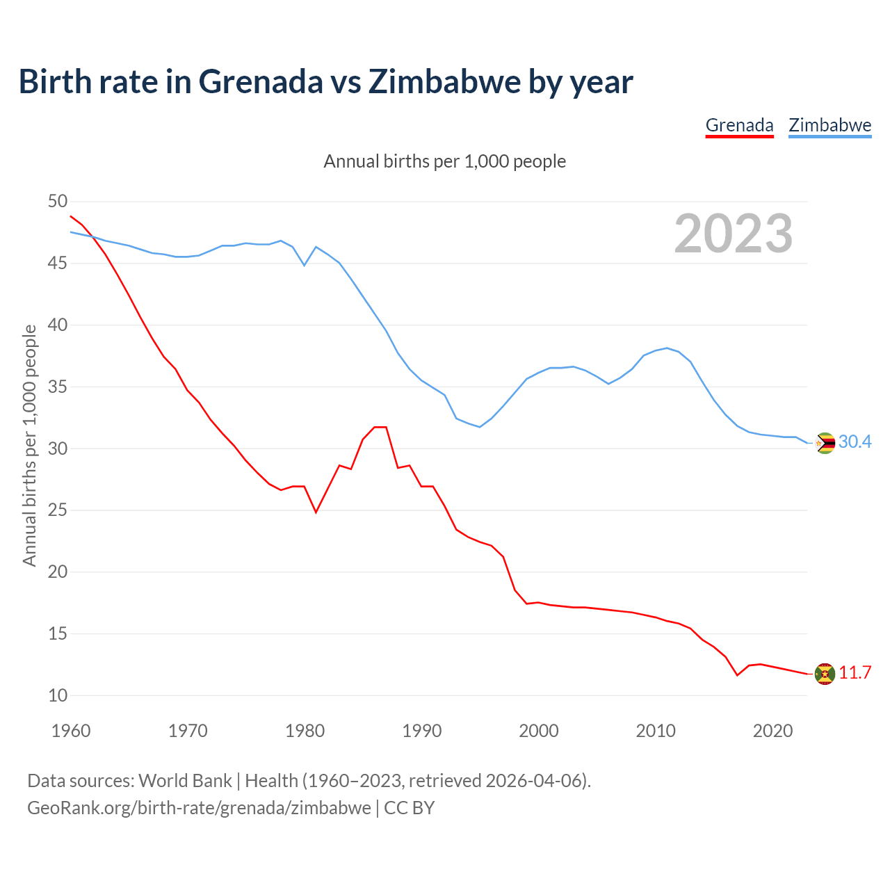 Grenada has an annual birth rate of 11.7 births per 1,000 people, compared to 30.4 for Zimbabwe. The average number of children a woman is expected to have during her lifetime — the fertility rate, is 1.49 in Grenada and 3.72 in Zimbabwe — 150.4% difference.