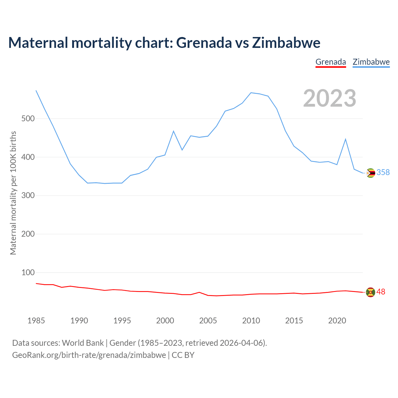 The maternal mortality rate, which is the probability of dying during childbirth or within 42 days of pregnancy termination, is 48 deaths per 100,000 live births in Grenada, compared to 358 deaths in Zimbabwe.