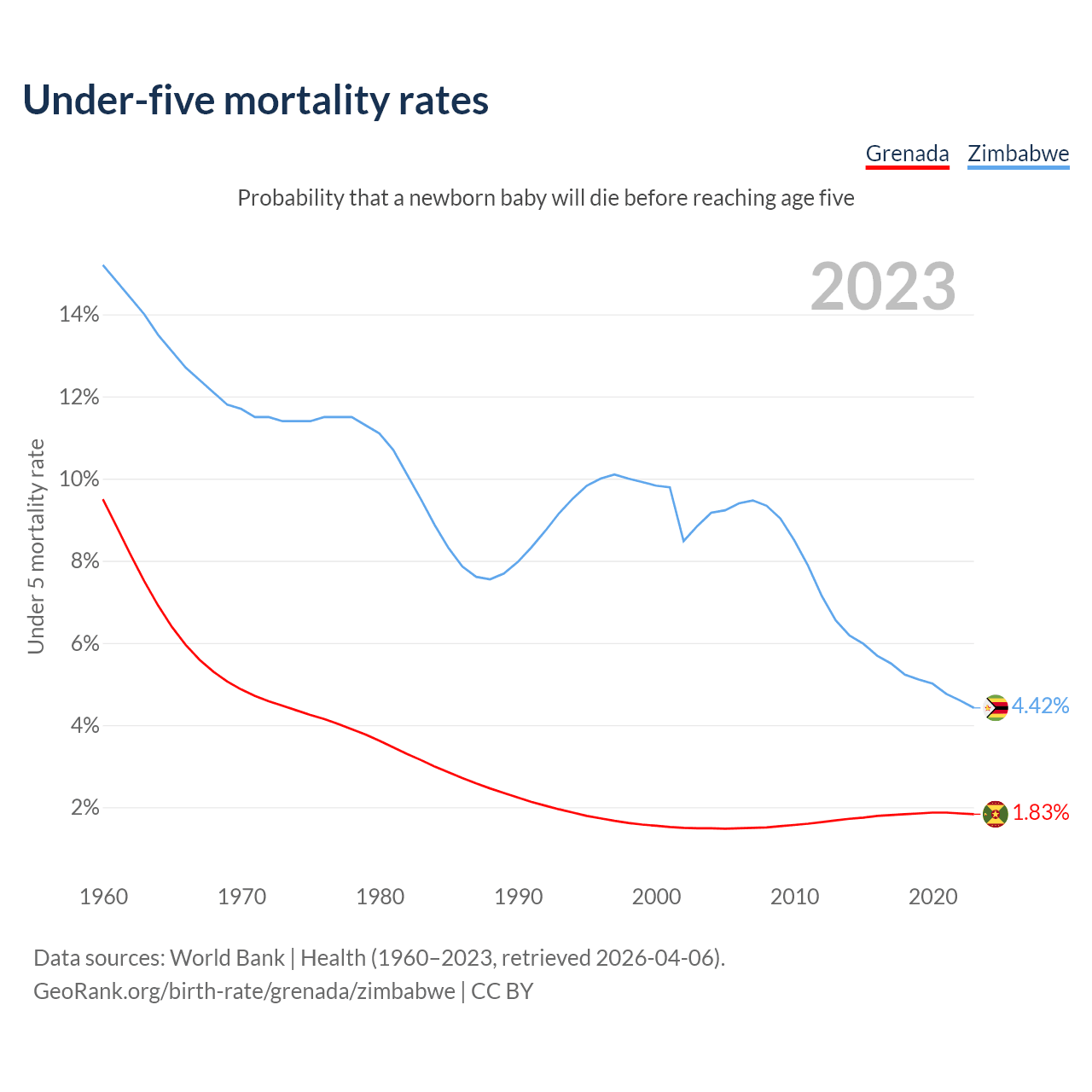 The chance that a newborn baby will die before reaching age five is 1.83% in Grenada and 4.42% in Zimbabwe. Above is a chart with historical data on under-five mortality rates.