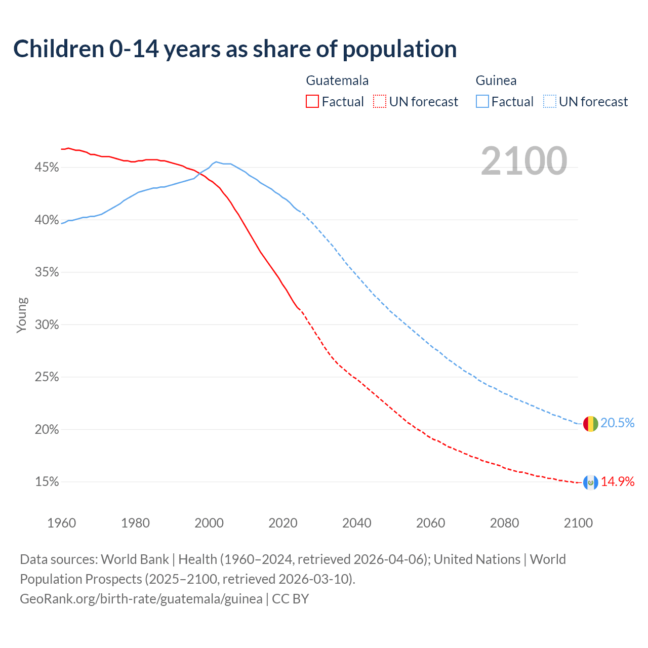 According to the latest available data on birth rates, the fertility rate in Guatemala was 2.31 children per woman in 2023, compared to 4.22 in Guinea in 2023. The replacement level is considered to be 2.1 children per woman.