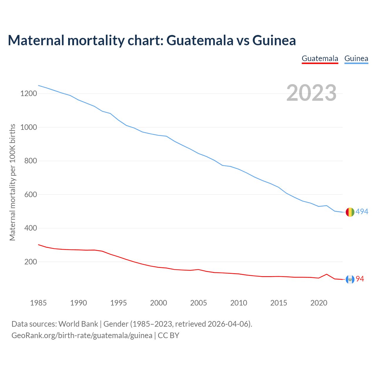 The maternal mortality rate, which is the probability of dying during childbirth or within 42 days of pregnancy termination, is 94 deaths per 100,000 live births in Guatemala, compared to 494 deaths in Guinea.
