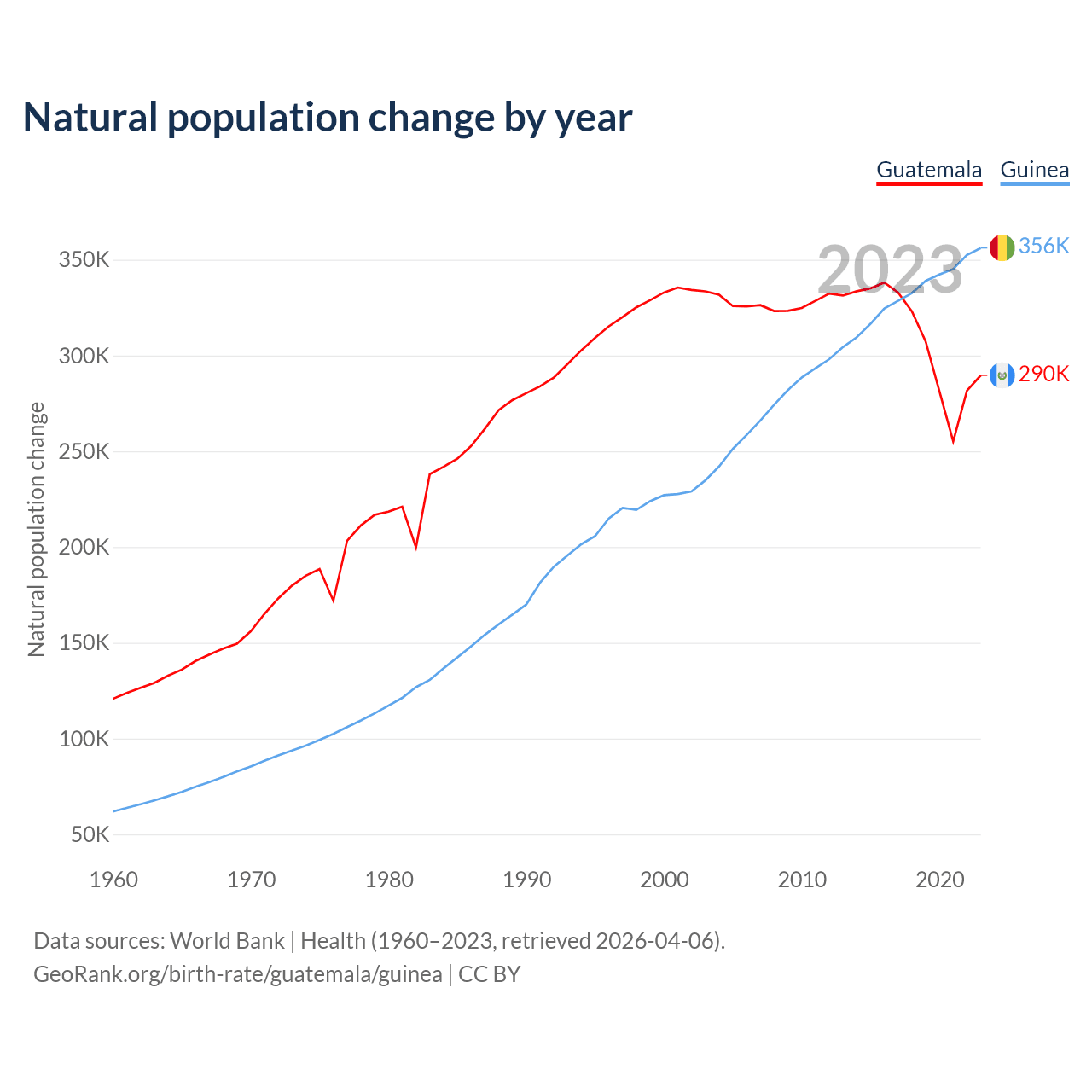 Guatemala has an annual birth rate of 20.8 births per 1,000 people, compared to 33.8 for Guinea. The average number of children a woman is expected to have during her lifetime — the fertility rate, is 2.31 in Guatemala and 4.22 in Guinea — 82.5% difference.