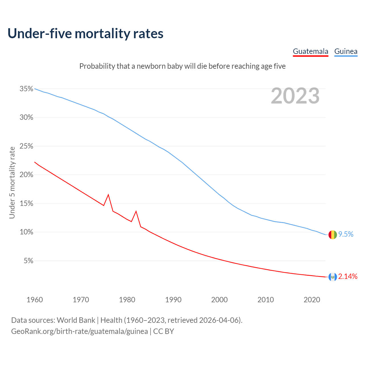 The chance that a newborn baby will die before reaching age five is 2.14% in Guatemala and 9.5% in Guinea. Above is a chart with historical data on under-five mortality rates.