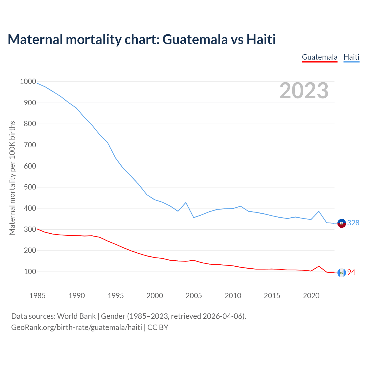 The maternal mortality rate, which is the probability of dying during childbirth or within 42 days of pregnancy termination, is 94 deaths per 100,000 live births in Guatemala, compared to 328 deaths in Haiti.