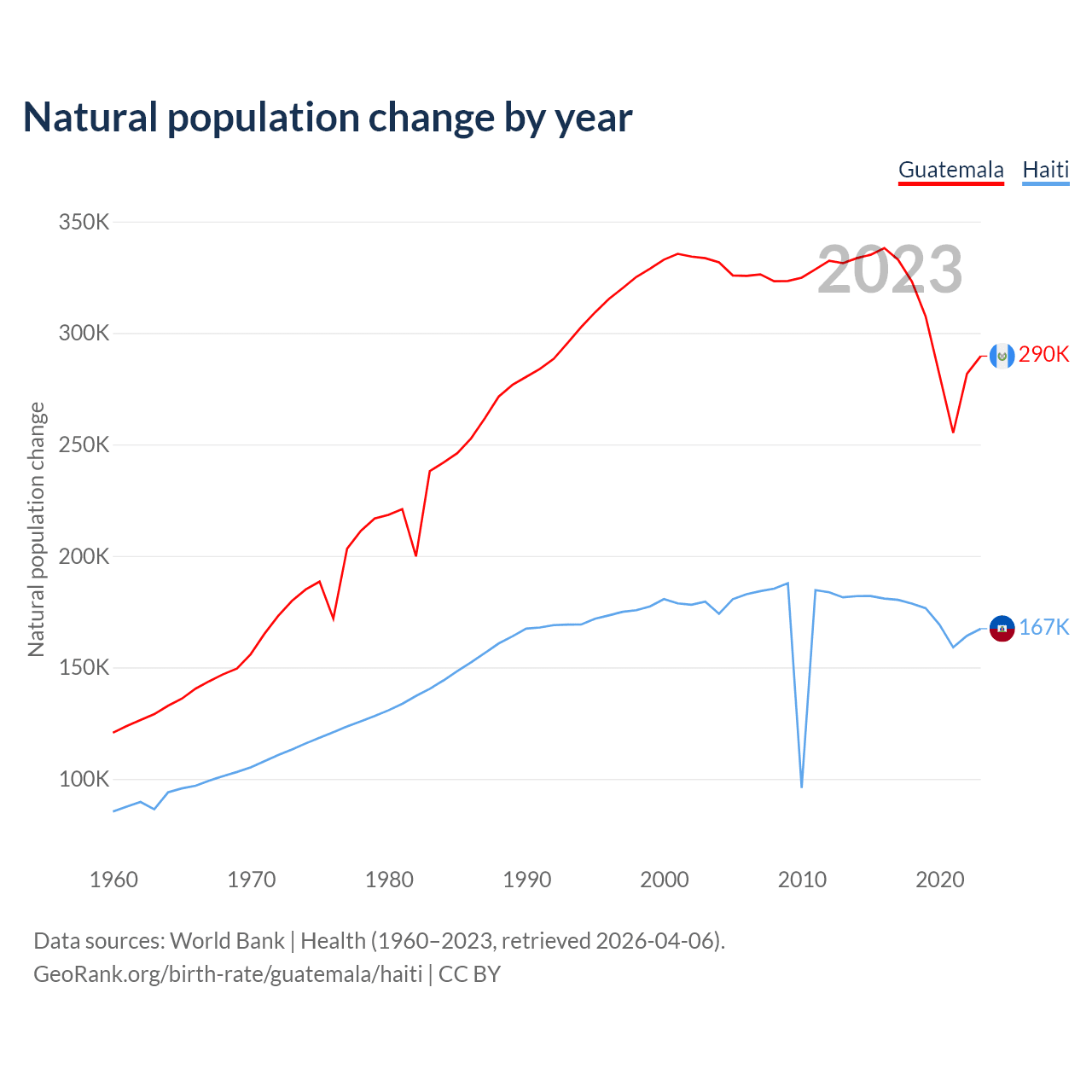 Guatemala has an annual birth rate of 20.8 births per 1,000 people, compared to 22.2 for Haiti. The average number of children a woman is expected to have during her lifetime — the fertility rate, is 2.31 in Guatemala and 2.66 in Haiti — 14.9% difference.