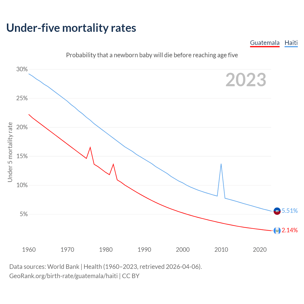 The chance that a newborn baby will die before reaching age five is 2.14% in Guatemala and 5.51% in Haiti. Above is a chart with historical data on under-five mortality rates.